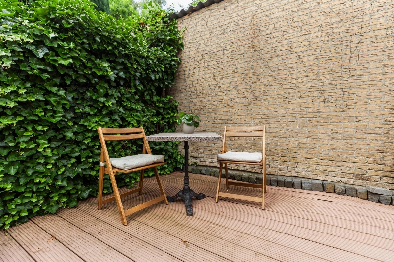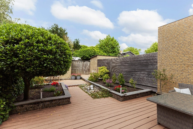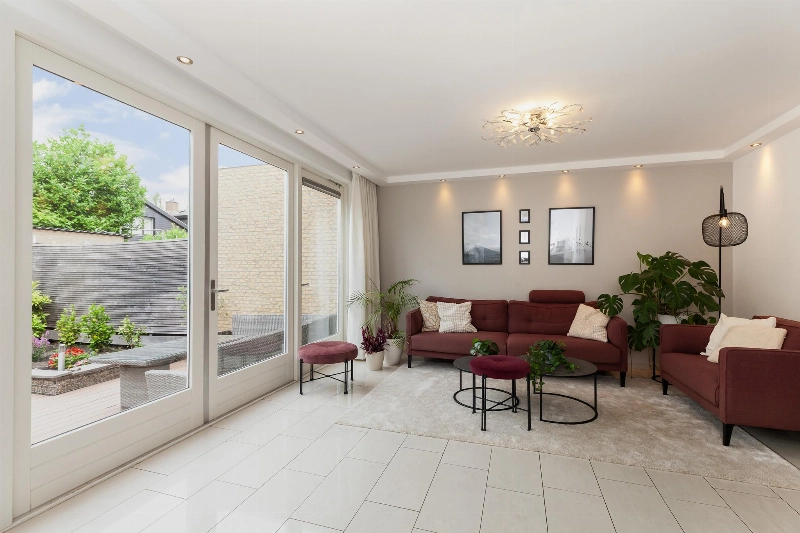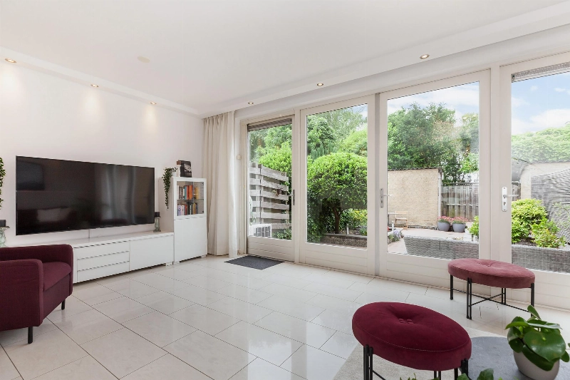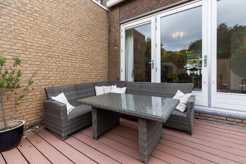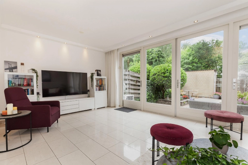 Het zitgedeelte van de woonkamer bevindt zich aan de tuinzijde en is opvallend ruim. Dankzij de vier brede, openslaande deuren is er een zee aan lichtinval én directe toegang tot de achtertuin. De tuin ligt op het zuidwesten, is verzorgd aangelegd met kunststof vlonders, groenborders, een buitenkraan, en een elektrisch zonnescherm. Hier geniet je de hele dag van de zon! Achterin de tuin bevindt zich een praktische stenen berging en een achterom via de steeg.