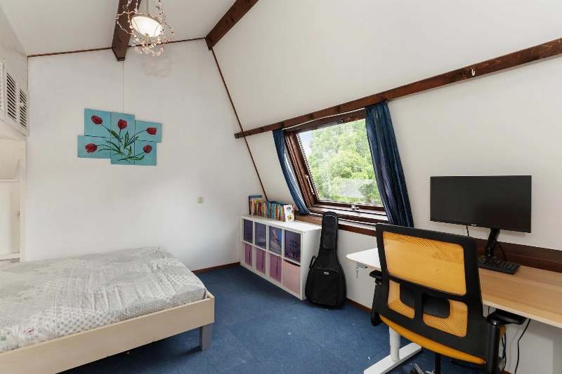 Aan de voorzijde bevindt zich de vierde slaapkamer, voorzien van een groot dakraam en een fraaie kastombouw. De zolder biedt bovendien de mogelijkheid om hier nog een extra kamer te realiseren.