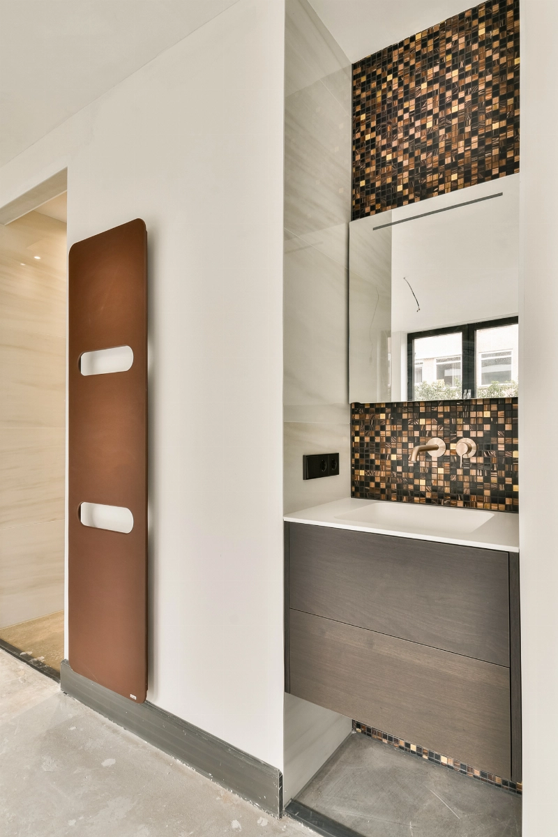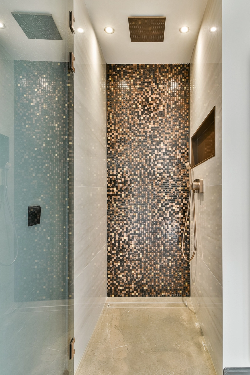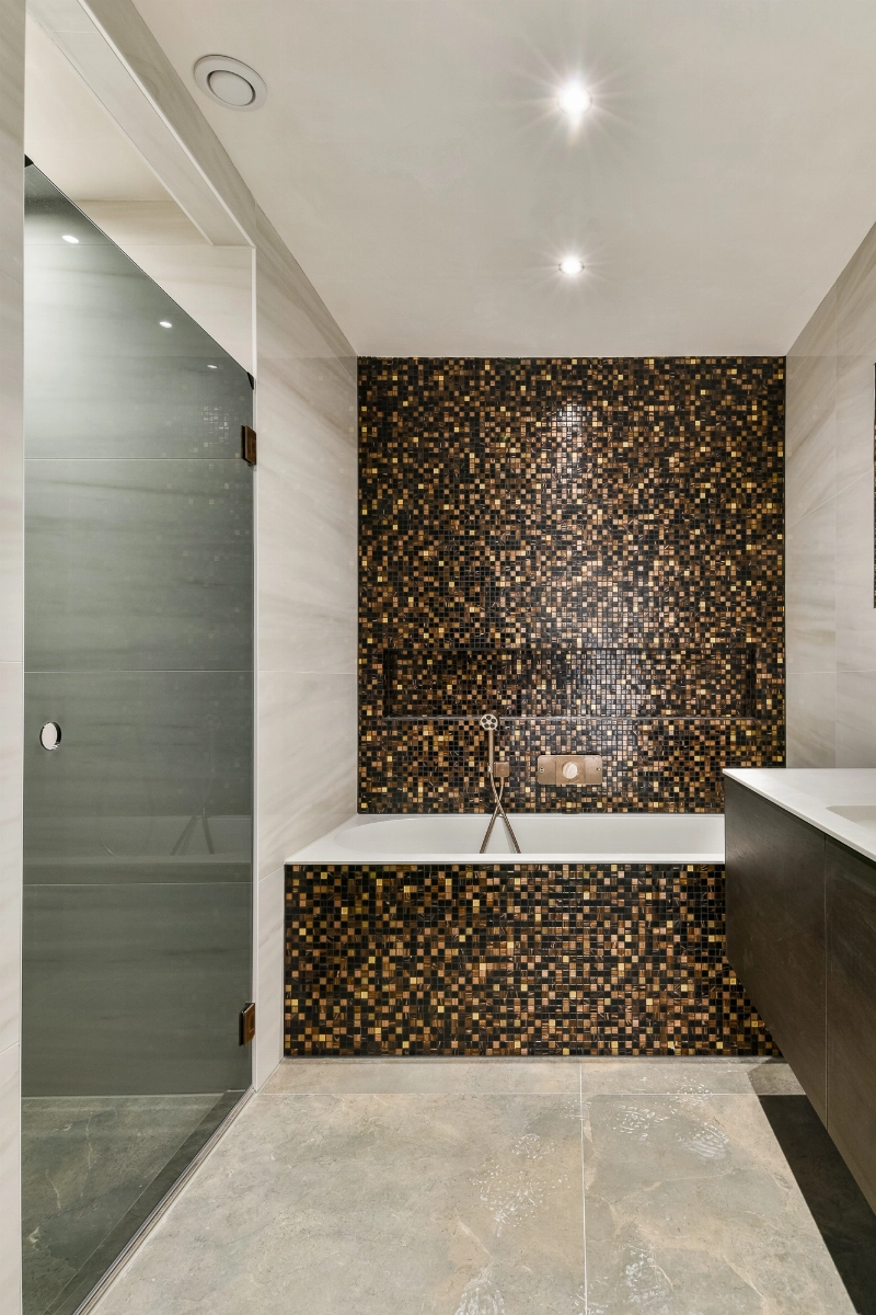 De separate badkamer is luxe uitgevoerd en voorzien van hoogwaardige betegeling, een wastafelmeubel met laden, een ligbad en een separate douchehoek met glazen douchescherm. De combinatie van moderne mozaïektegels en hoogwaardige kranen zorgt voor een verfijnde uitstraling.