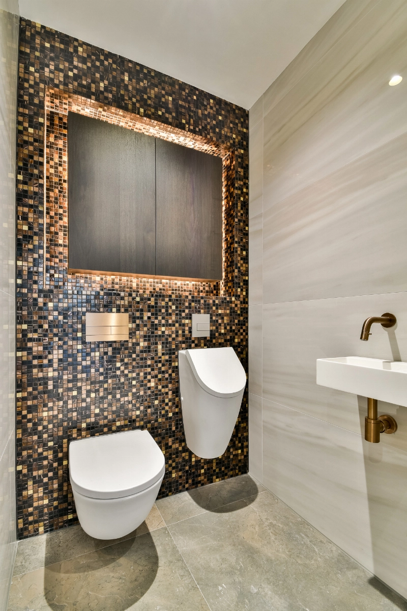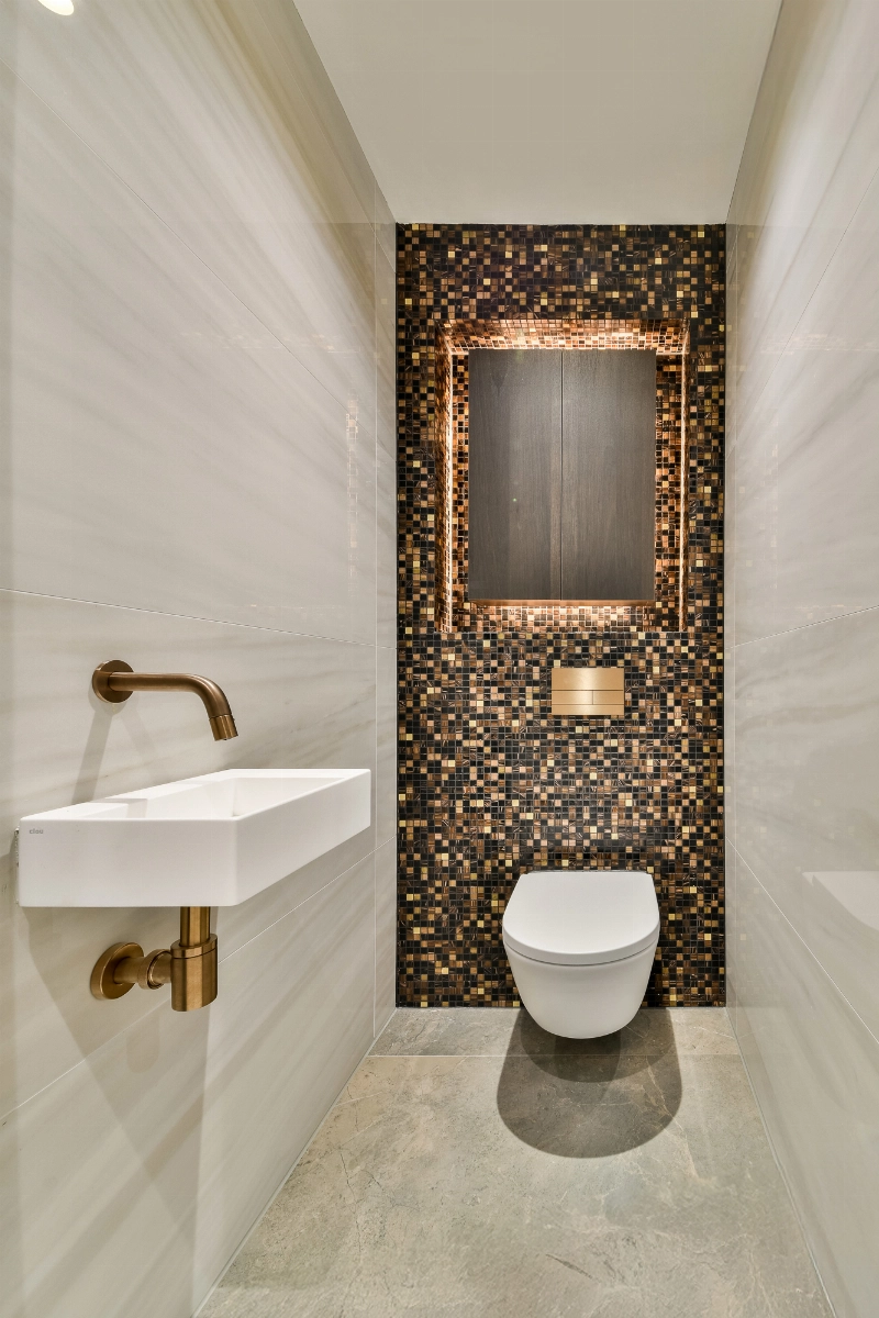 Terug in de gang bevinden zich de meterkast, twee luxe toiletruimtes voorzien van zwevend closet, urinoir en fontein, alsmede de technische ruimte met aansluitingen voor wasmachine en droger en de opstelling van de warmtepomp en ventilatie-installatie.