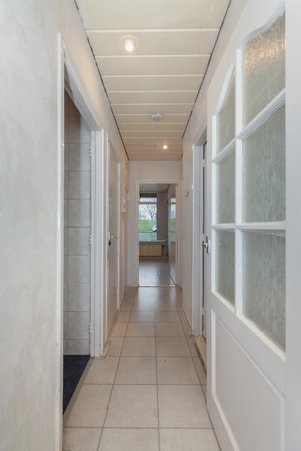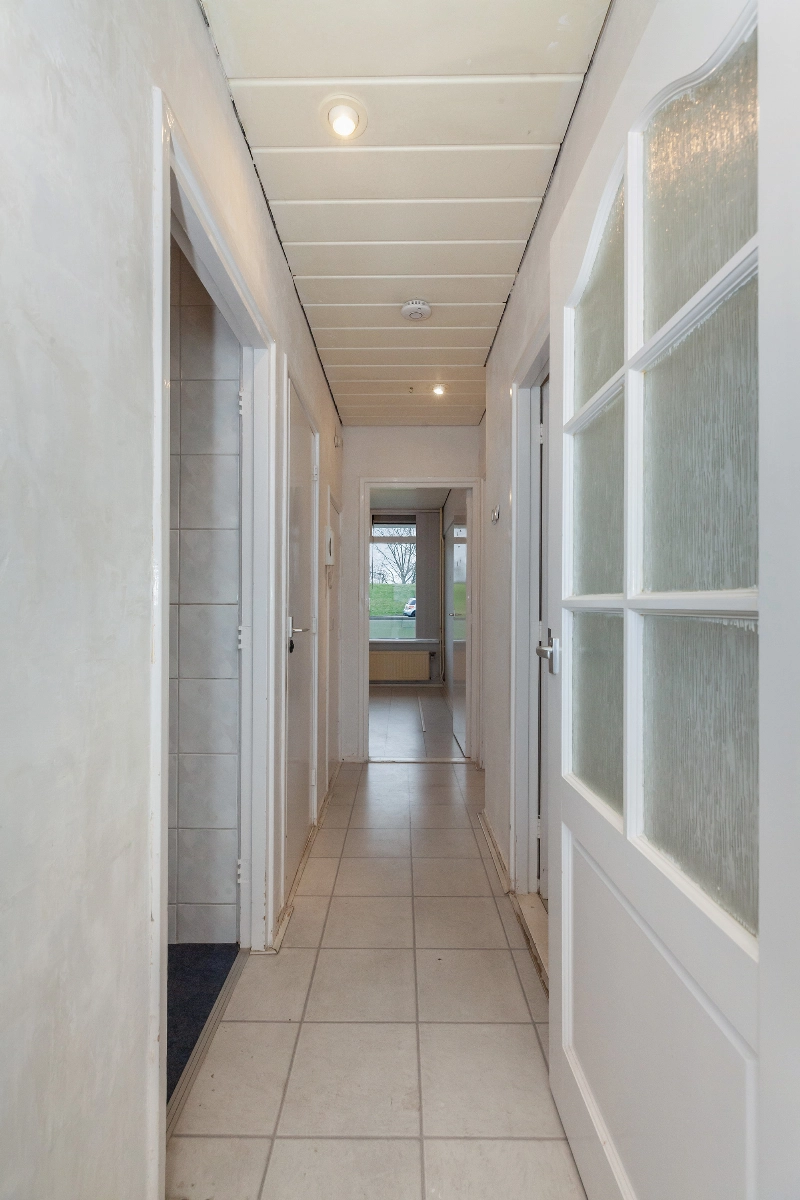 Via het afgesloten portiek bereik je het appartement op de eerste verdieping. Je komt binnen in een tochtportaal, waarna je de ruime hal betreedt die toegang geeft tot vrijwel alle vertrekken.