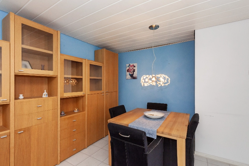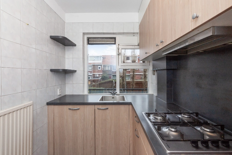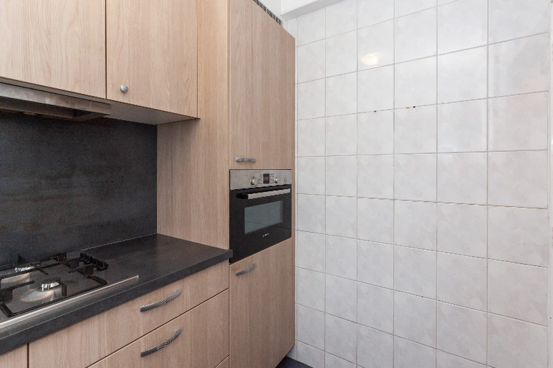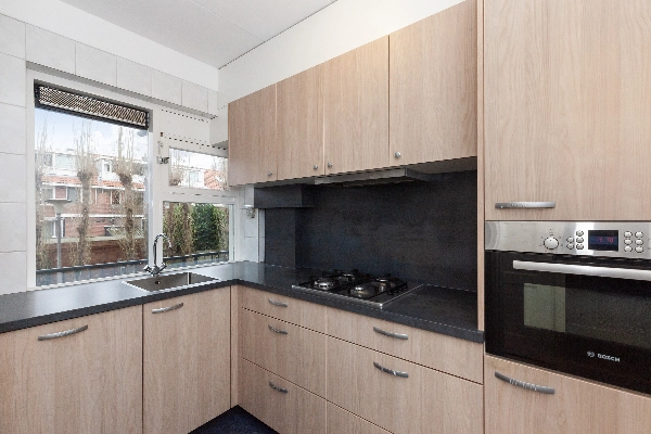 De keuken bevindt zich aan de voorzijde en is praktisch ingericht in een hoekopstelling. Uitgevoerd in een moderne eikenlook en voorzien van een donker werkblad. De keuken is compleet uitgerust met een 4-pits gaskookplaat, afzuigkap, koelkast, vriezer, combi-oven en vaatwasser. In een aparte kast bevindt zich de cv-ketel.