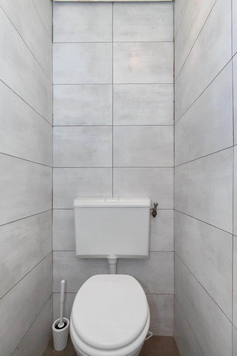 Het separate toilet bevindt zich in de hal en is volledig betegeld, voorzien van een staand closet en een fonteintje.