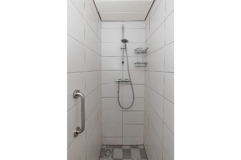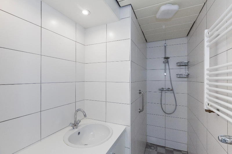 De badkamer is netjes afgewerkt met witte wandtegels en antracietkleurige vloertegels en beschikt over een inloopdouche, wastafelmeubel en wasmachineaansluiting.