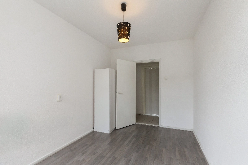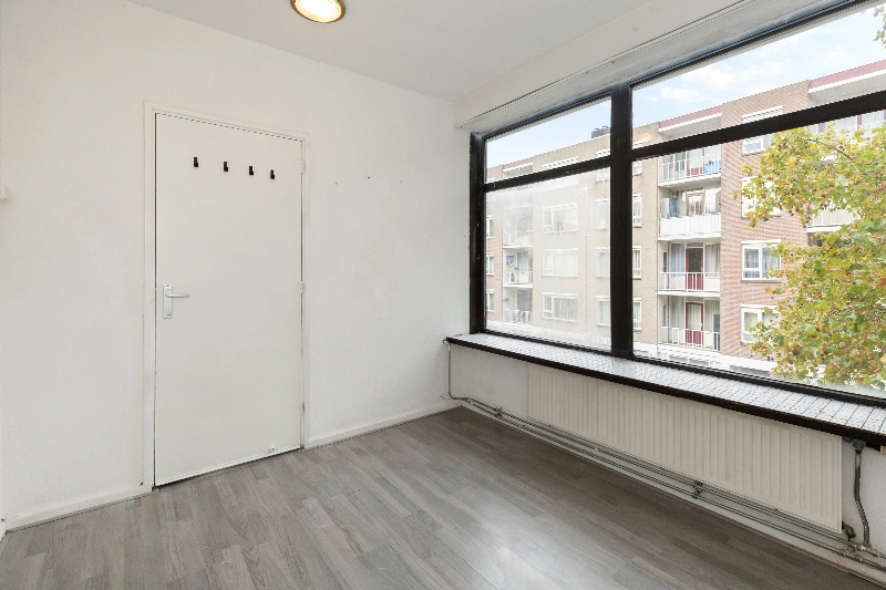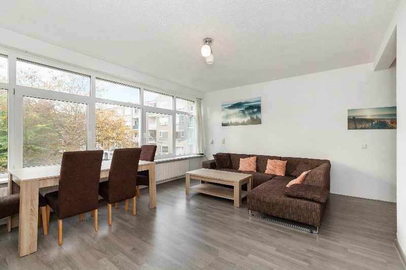 De ruime woonkamer is een fijne en lichte ruimte voorzien van gespoten wanden, laminaatvloer, dubbel glas en een vrij uitzicht. Er is een deur naar het zonnige balkon op het zuiden. Via de woonkamer bereik je slaapkamer I. deze is op de hoek gelegen en is voorzien van een laminaatvloer en spuitwerkwanden.