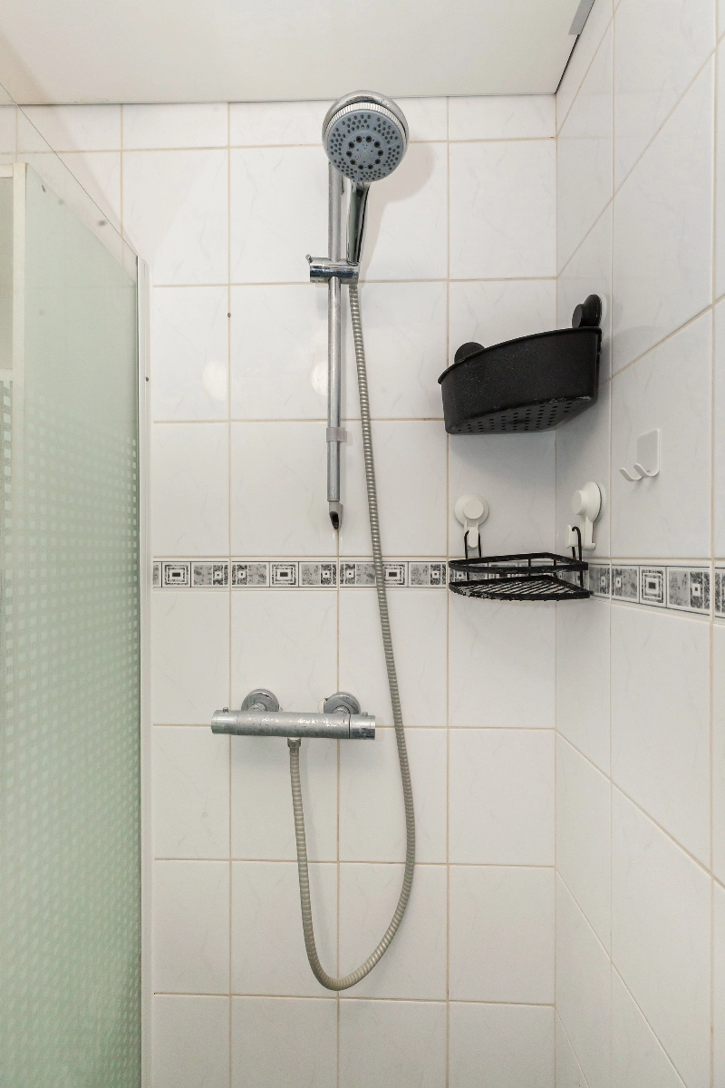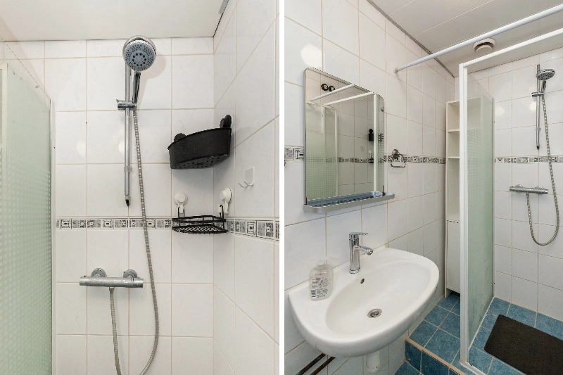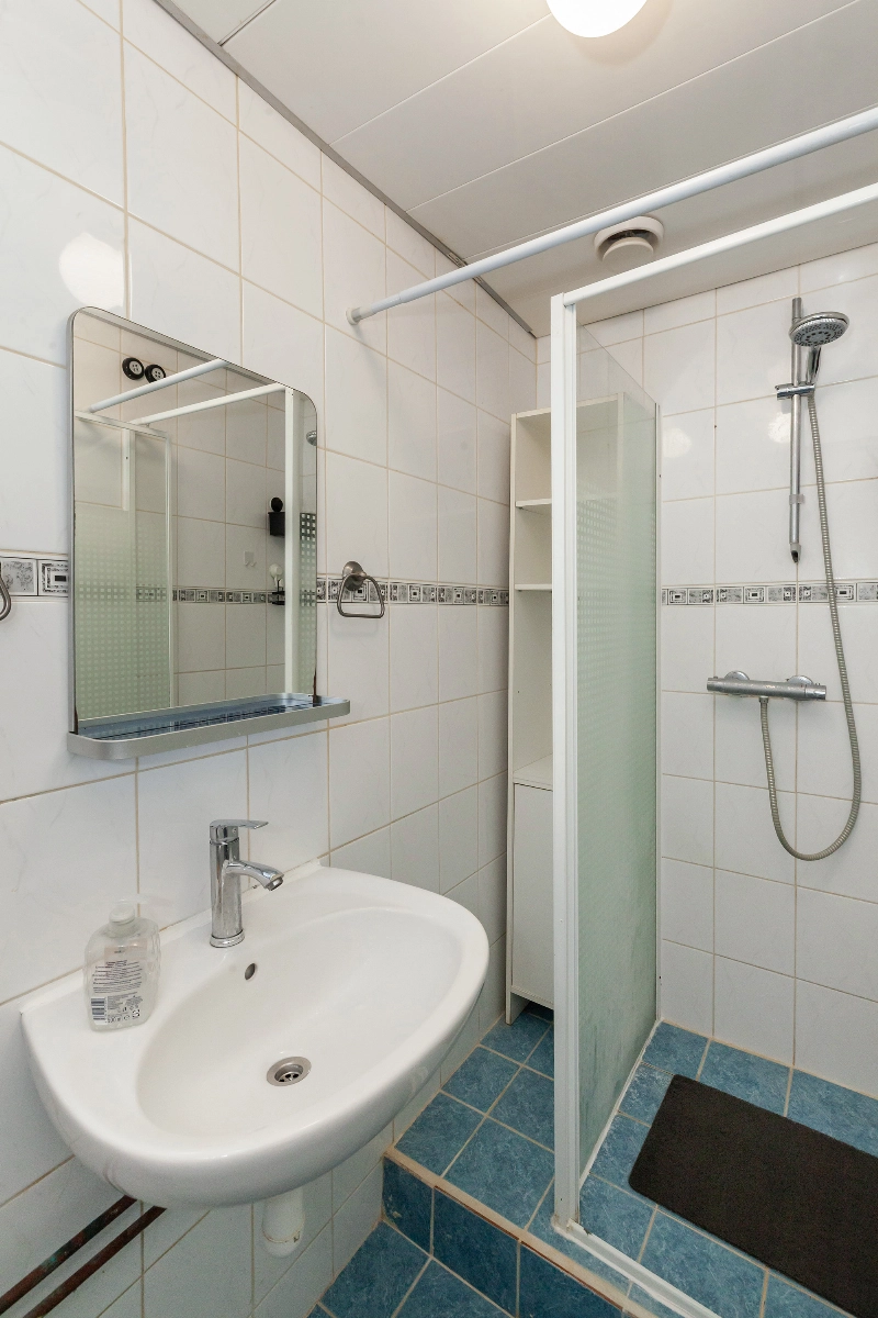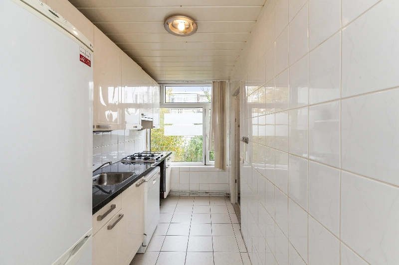 Entree op de 2e woonlaag. Ruime gang met plavuizenvloer welke doorloopt naar de keuken. Verder is er een meterkast, een geheel betegeld toilet en een vaste kast. De keuken ligt aan de voorzijde en is voorzien van een keurige witte opstelling met granieten aanrechtblad, gaskookplaat, afzuigvlakscherm en een vaatwasser. Vanuit de keuken is er een toegang naar de doucheruimte. Deze is geheel wit/blauw betegeld en voorzien van een wastafel en een douchehoek. Hier vindt je ook de aansluiting voor de wasmachine en de CV.