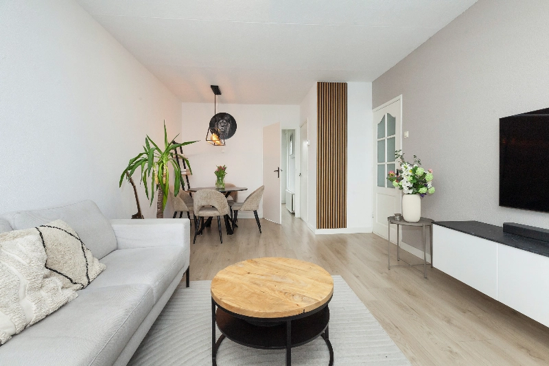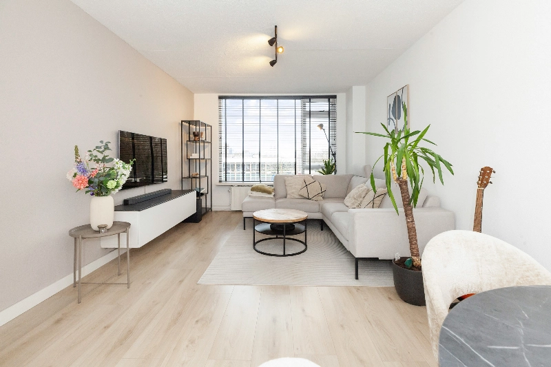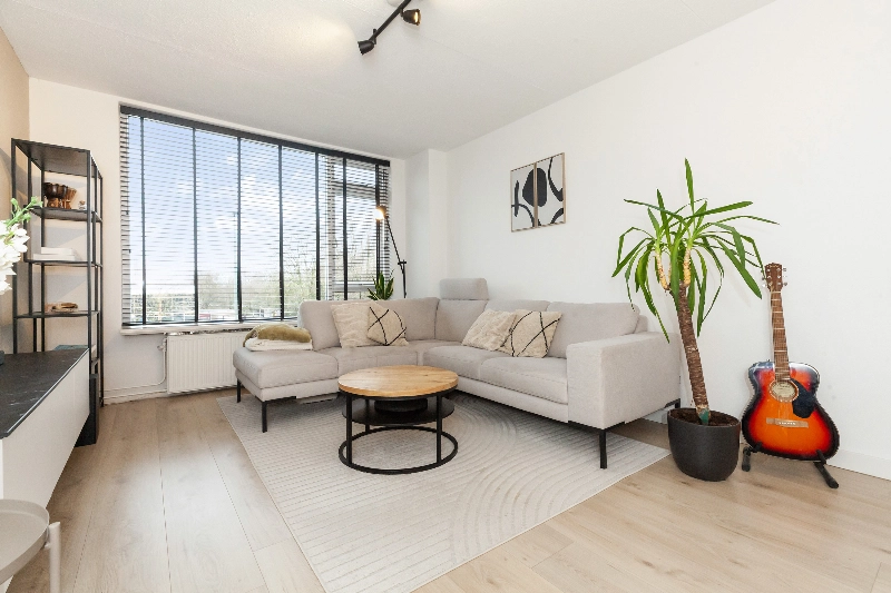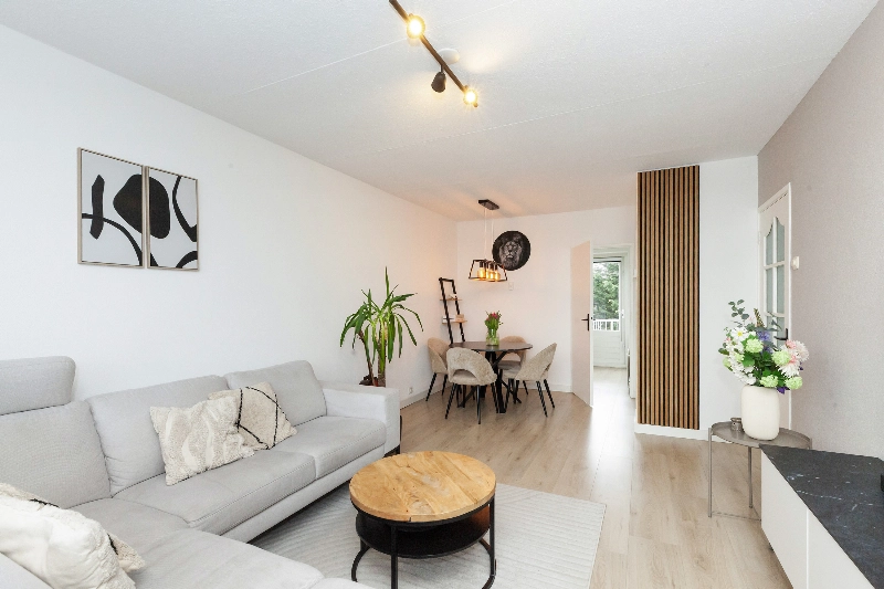 Bij binnenkomst valt direct de prettige lichtinval op, die zorgt voor een warme en uitnodigende sfeer. De vloer is afgewerkt met een laminaatvloer welke doorloopt in het gehele appartement, de de wanden zijn strak afgewerkt.