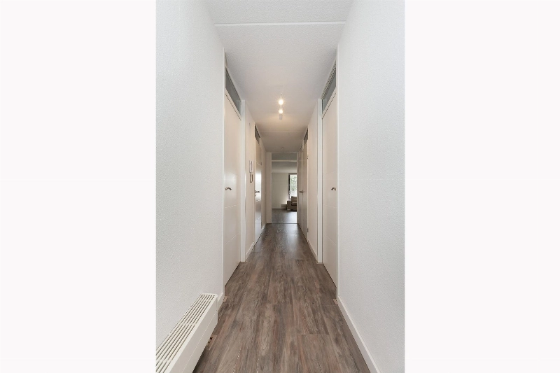 Bij binnenkomst kom je in een brede gang met een mooie laminaatvloer welke doorloopt in het gehele appartement. Wat een mooie ruimte! Verder vind je hier de meterkast, een geheel luxe betegelde toiletruimte met zwevend closet en een fontein en direct naast het toilet ligt de inpandige berging met opstelplaats voor de CV, mv, droger en wasmachine.