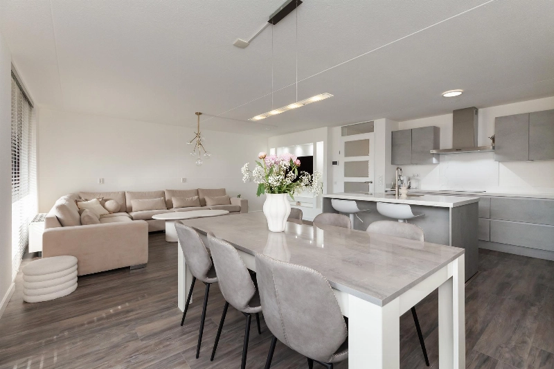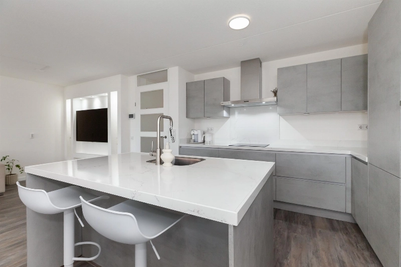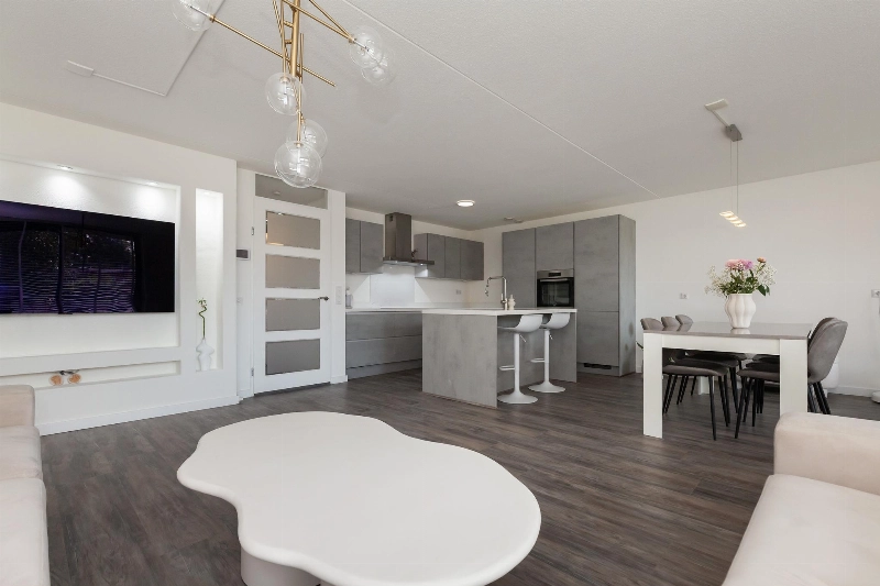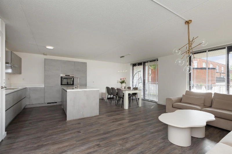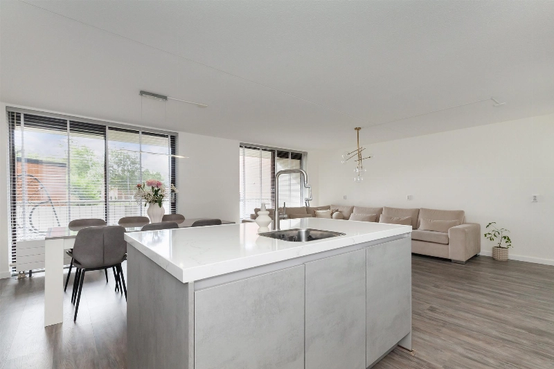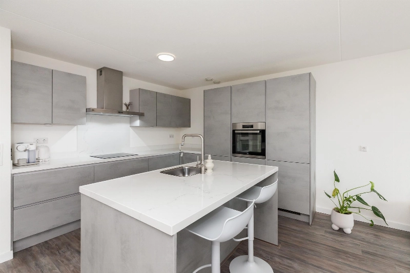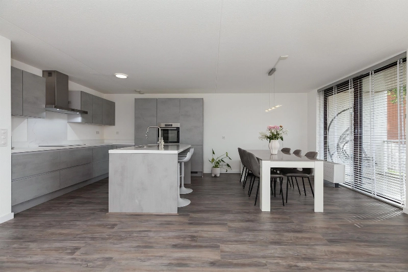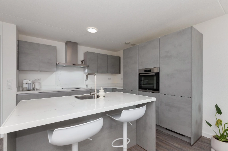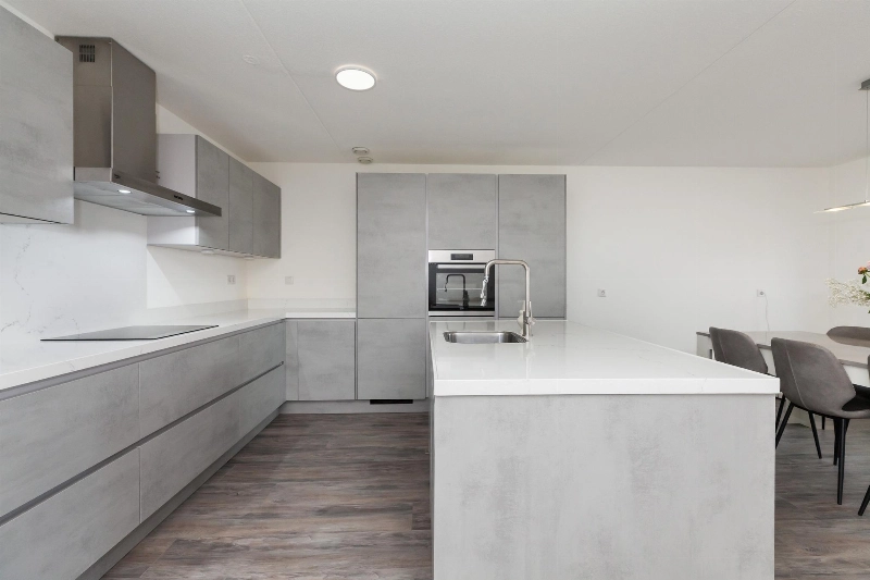 De prachtige moderne open keuken is uitgevoerd in een licht grijze betonlook opstelling met grote hoekopstelling voorzien van koelkast, vriezer, combi-oven, inductiekookplaat, afzuiging en een vaatwasser. Daarnaast is er een mooi eiland met veel bergruimte en een composiet-marmerlook aanrechtblad. Deze keuken is compleet en maakt een mooi geheel met de prachtige woonkamer!