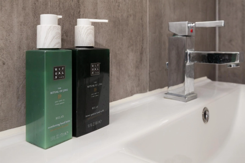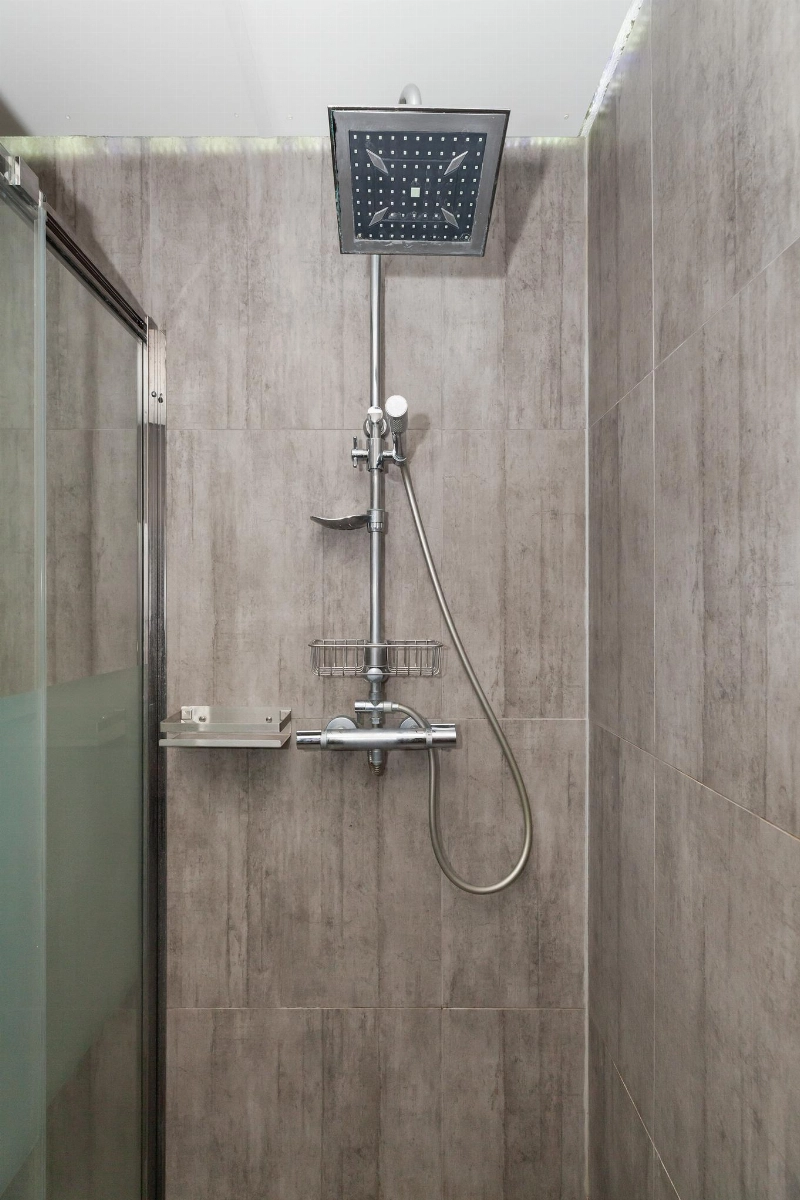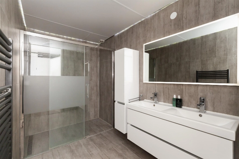 En dan de badkamer.... Deze is geheel luxe en warm betegeld en is voorzien van een ruime inloopdouche met glazen schuifwand, een breed wastafelmeubel met dubbele kraan en een verlichte spiegel. Voor het comfort is er een handdoekenradiator aanwezig.