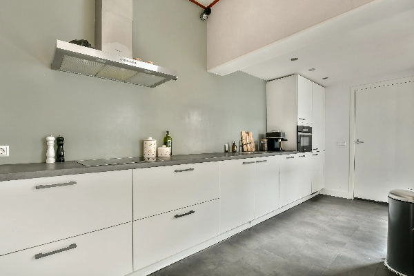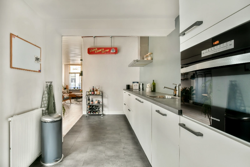 Vanuit de woonkamer loopt u naadloos door naar de ruime, lichte open keuken. Deze is van alle gemakken voorzien: een witte, rechte opstelling met stijlvol antraciet werkblad, volop lades, een inductiekookplaat, afzuigkap en vaatwasser. Daarnaast biedt de hoge kastenwand plaats aan de combi-oven, koelkast en vriezer.
