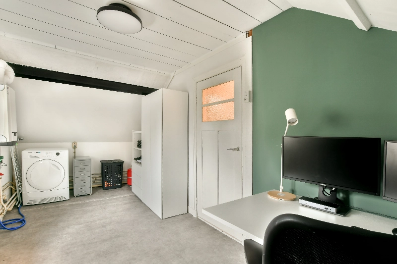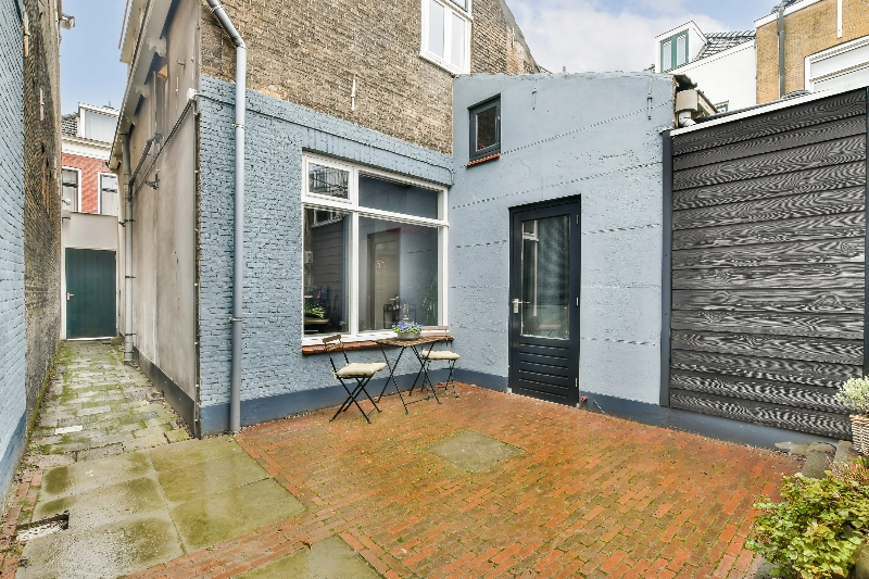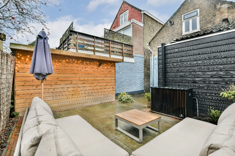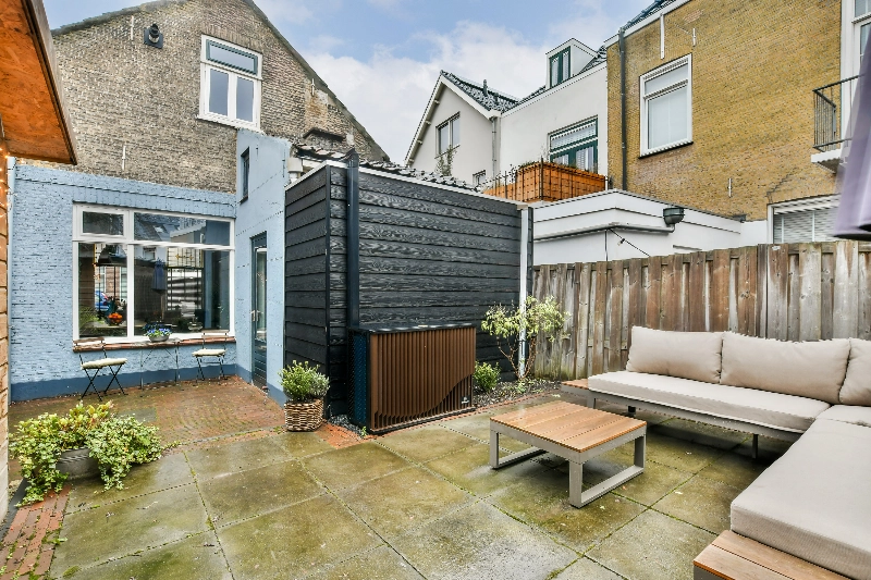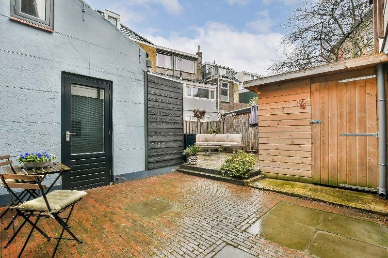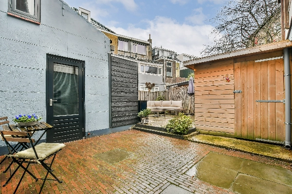 Vanuit de keuken loopt u zo de zonnige achtertuin in. Hier staat de buitenunit van de warmtepomp en een grote houten berging met elektra, perfect voor fietsen of opslag. De tuin heeft bovendien een eigen steeg naar de voorkant van de woning, dus u kunt makkelijk bij de fietsen zonder door het huis te hoeven.