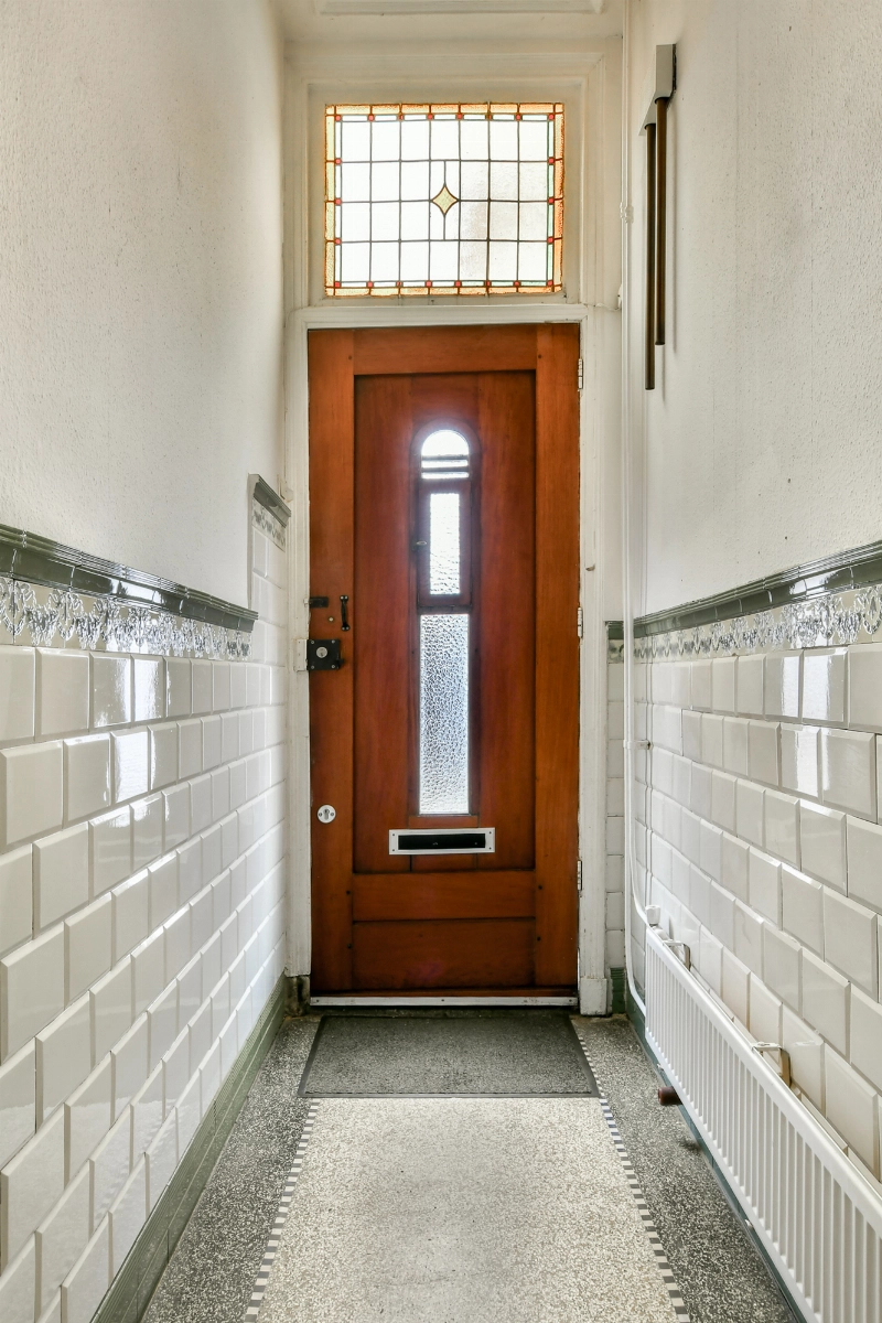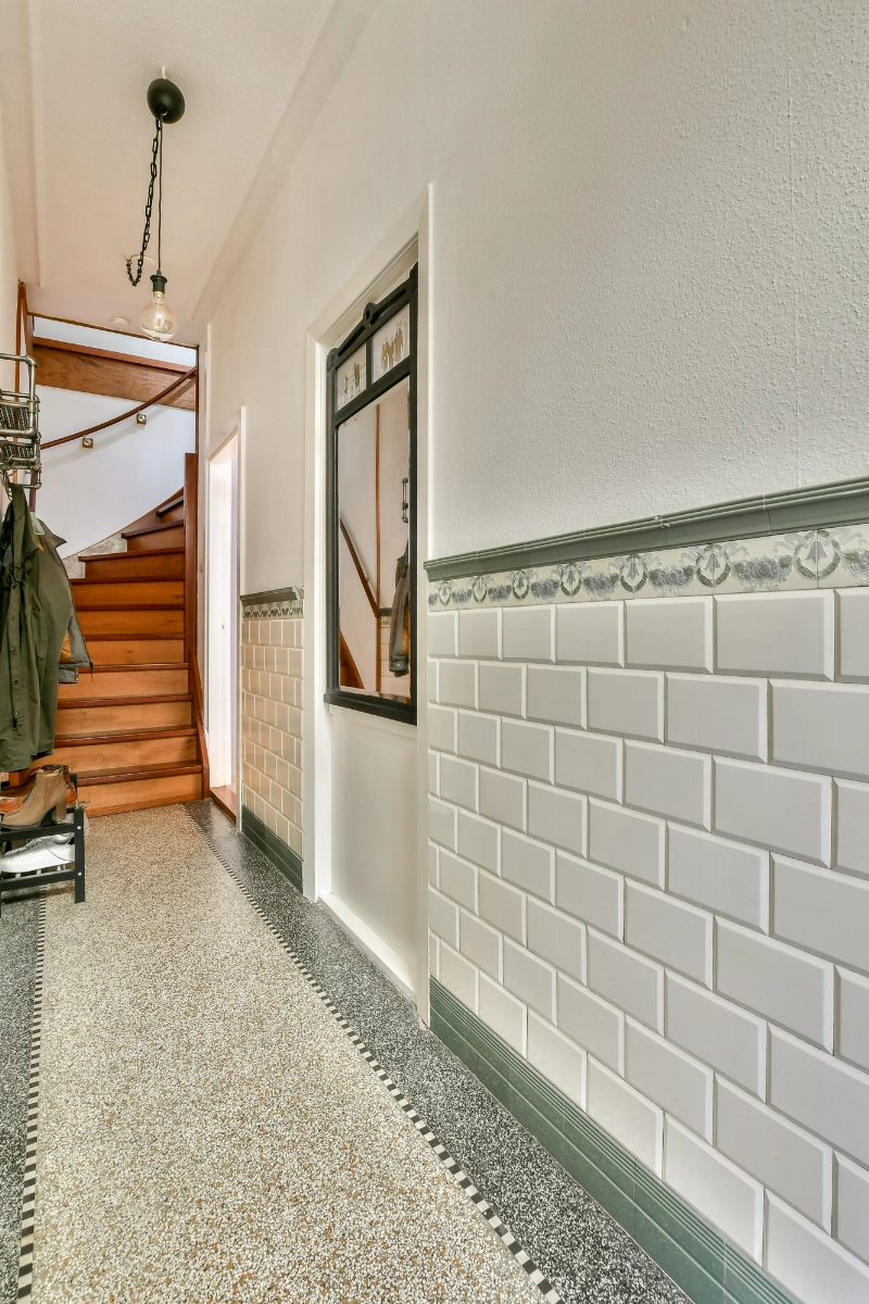 Via de entree komt u binnen door een voordeur met glas-in-lood bovenlicht. In de ruime hal ligt een granitovloer met originele tegels. Vanuit de hal bereikt u de trap naar de eerste verdieping en de deur naar de woonkamer.