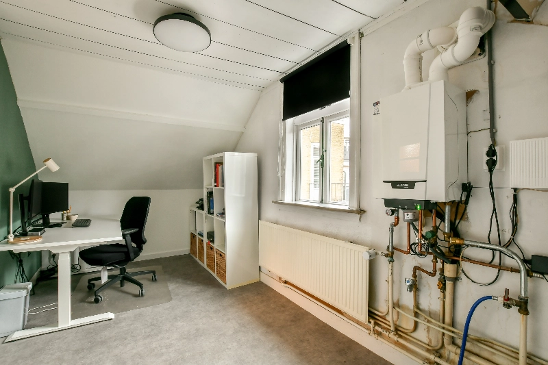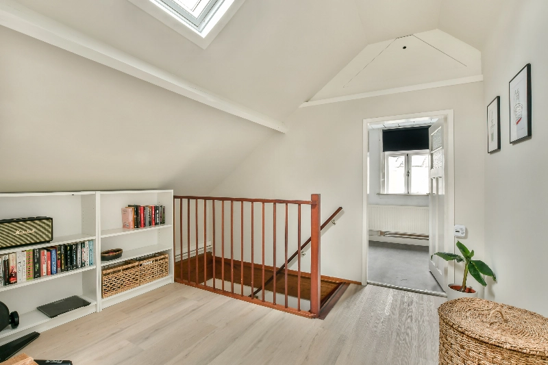Op de eerste verdieping komt u uit op een ruime overloop met een dakraam, waardoor er prettig veel licht binnenvalt. Dit is een ideale plek voor een bureau of werkruimte. Vanuit de overloop is er ook toegang tot een luik naar de bergvliering.