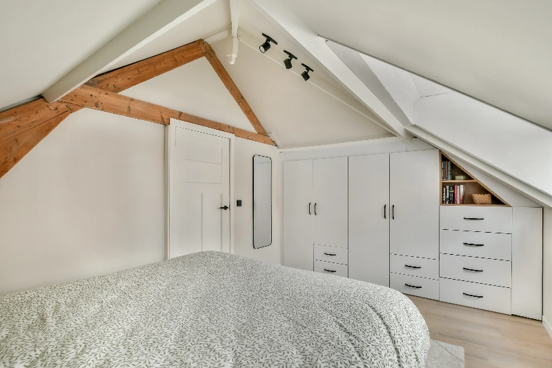 Slaapkamer I ligt aan de voorkant en heeft een ingebouwde kast, een mooie hoge nok met houten dakspanten en een dakraam dat voor extra licht zorgt.