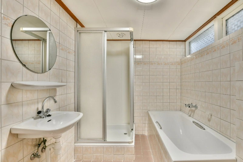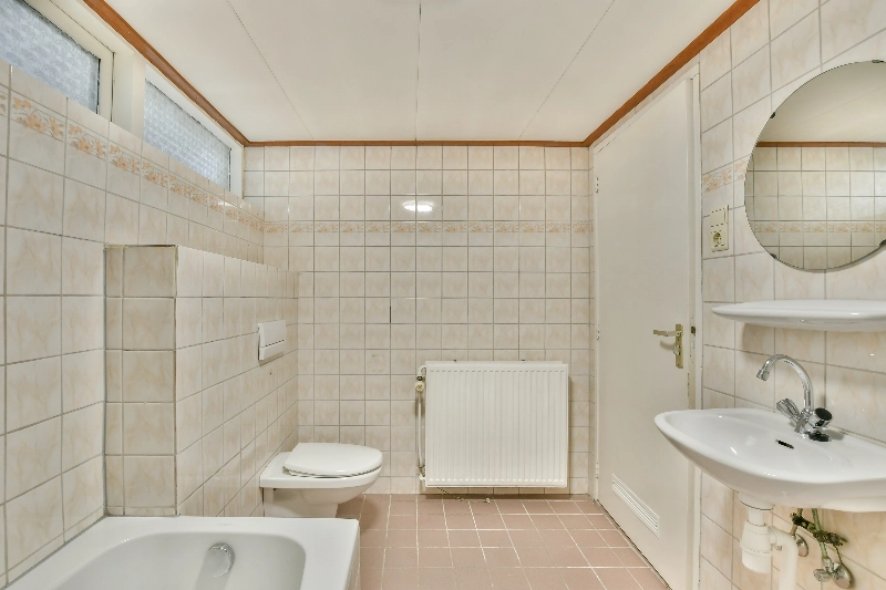 De ruime badkamer is volledig betegeld en voorzien van een wastafel, douchehoek, ligbad, zwevend toilet en radiator.