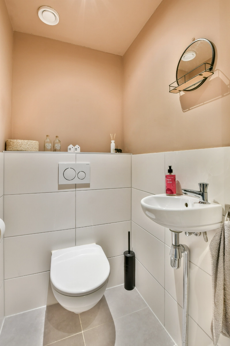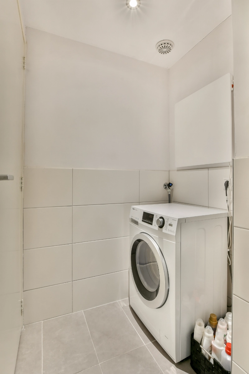 Achter de keuken is een tussenhal die modern is betegeld en nu als wasruimte in gebruik is, met aansluiting voor de wasmachine. Hier vindt u ook het modern betegelde toilet met zwevend closet en fonteintje.