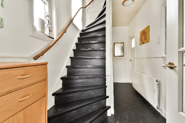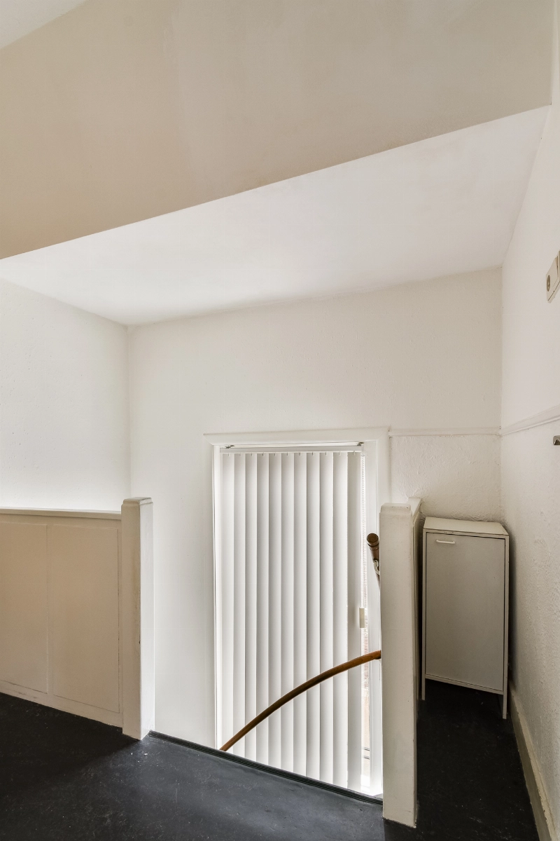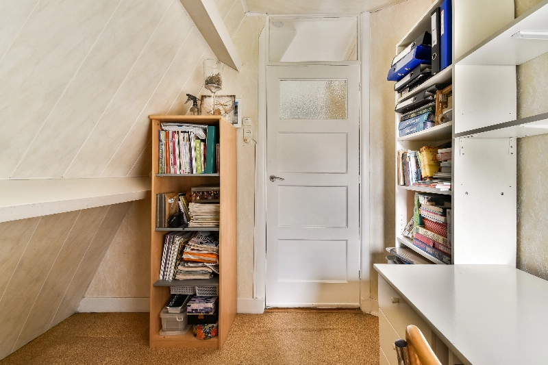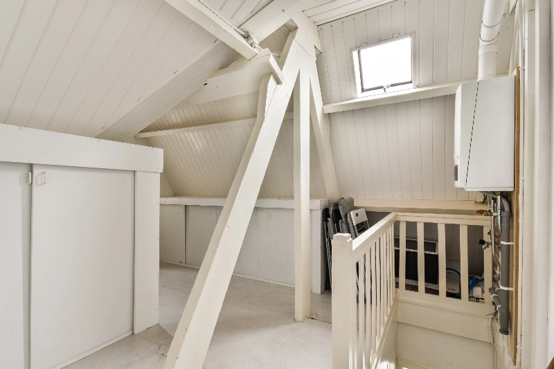Ruime overloop met karakteristieke zichtbare spanten, opstelling van de c.v. combiketel (2017) en veel bergruimte achter de schotten. Eventueel kan hier eenvoudig een extra kamer worden gerealiseerd.