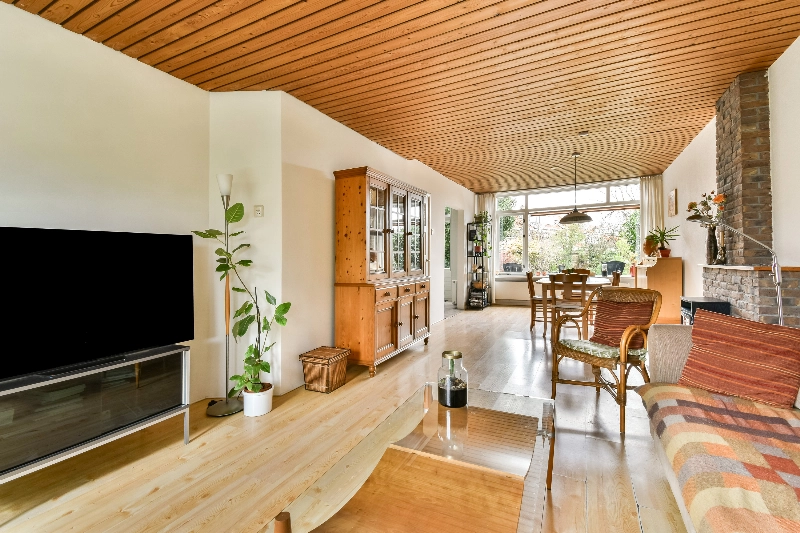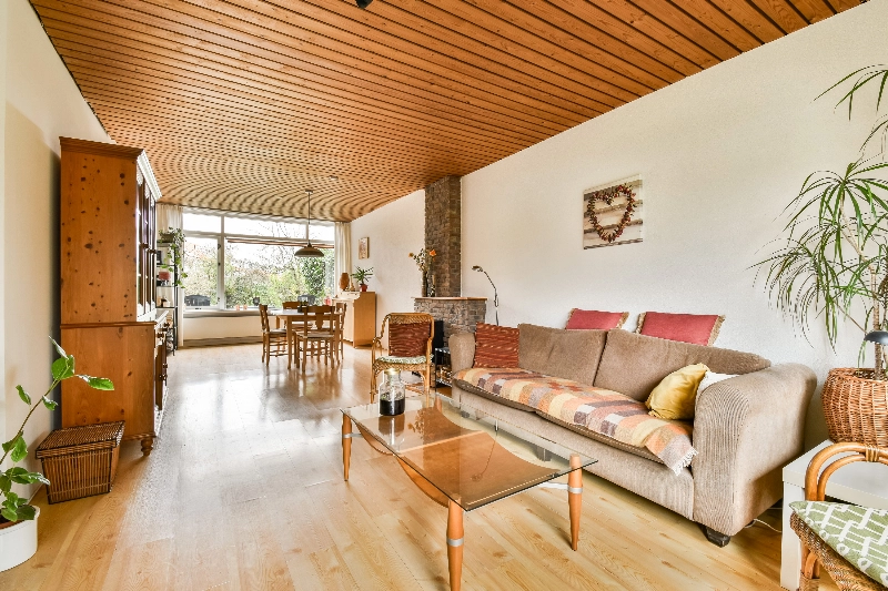 Riante woonkamer met veel lichtinval door de grote raampartijen aan de voor- en achterzijde.