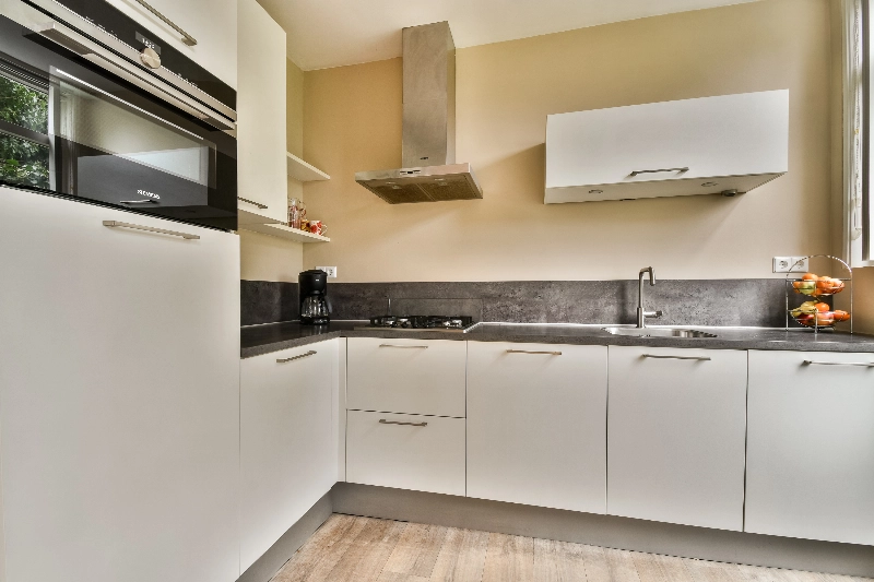 De moderne open keuken heeft witte fronten, een betonlook aanrechtblad en is voorzien van de volgende Siemens inbouwapparatuur: een 4 pits RVS gaskookplaat, een RVS afzuigkap, een koelkast, een diepvriezer, een combimagnetron en een vaatwasser.