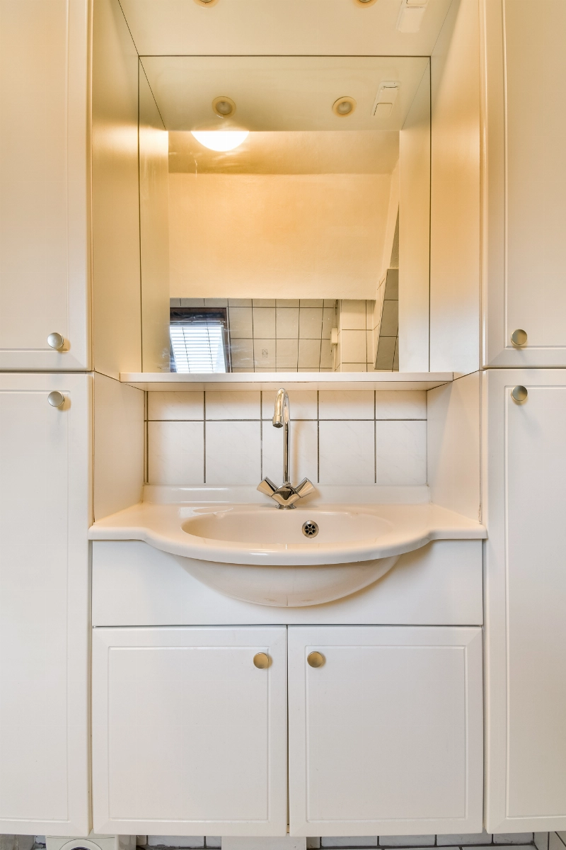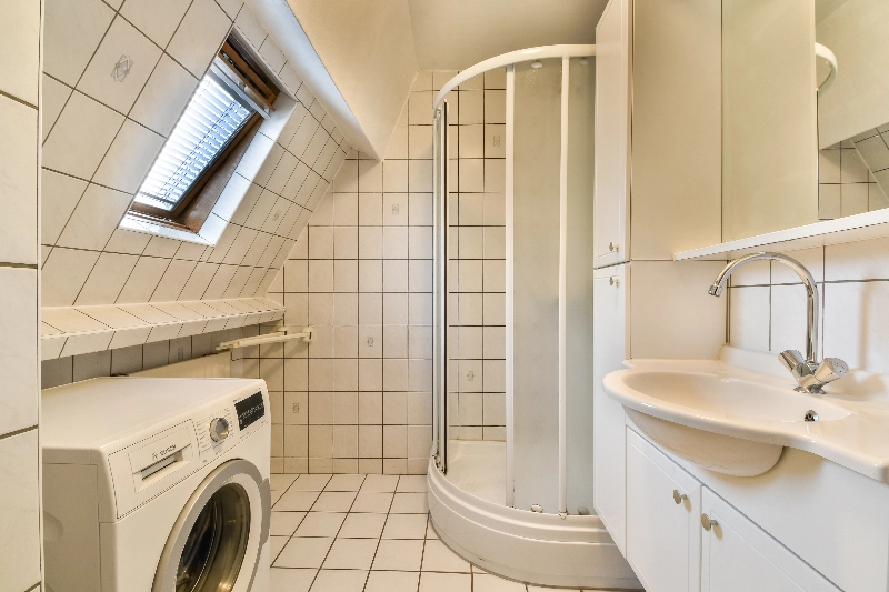 De ruime badkamer is uitgevoerd in een lichte kleurstelling en beschikt over een douchehoek, een wastafelmeubel met spiegel, wasmachine aansluiting en een Veluxraam voor extra lichtinval.