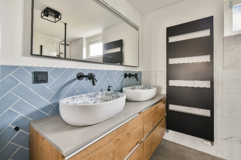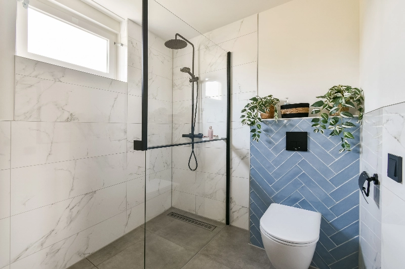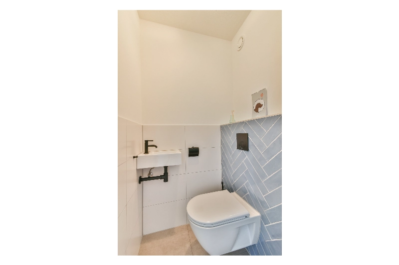 De moderne badkamer is in 2021 vernieuwd en is mooi afgewerkt met o.a. marmerlook- en zachtblauwe visgraatbetegeling en prachtige waskommen met Delftsblauwe print. Er is verder een grote inloopdouche, 2e toilet, breed wastafelmeubel met die mooie waskommen, radiator en een raam zorgt voor daglicht.