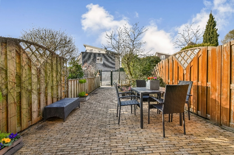 De diepe achtertuin is keurig aangelegd met bestrating en groen en is zonnig op het westen gelegen zodat je hier heerlijk van buiten kunt genieten. Het hekwerk aan de achterzijde sluit aan op een autoluw binnenterrein zodat kinderen hier veilig kunnen spelen. Tevens is er een stenen berging voor extra bergruimte.