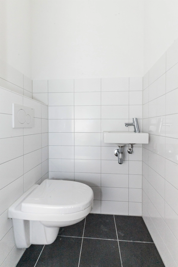 Verder bevinden zich hier de meterkast, de trapopgang naar de verdieping met praktische trapkast en een gedeeltelijk betegelde toiletruimte met zwevend closet en fonteintje.