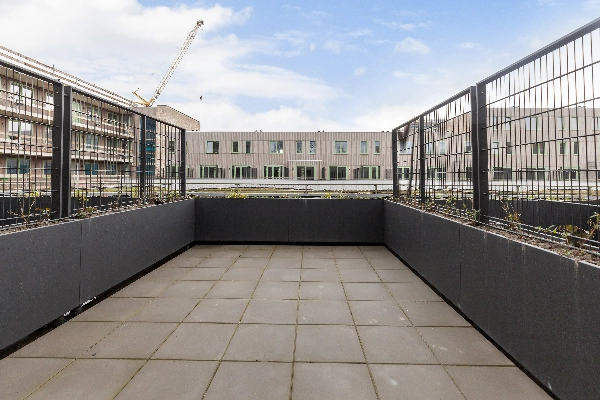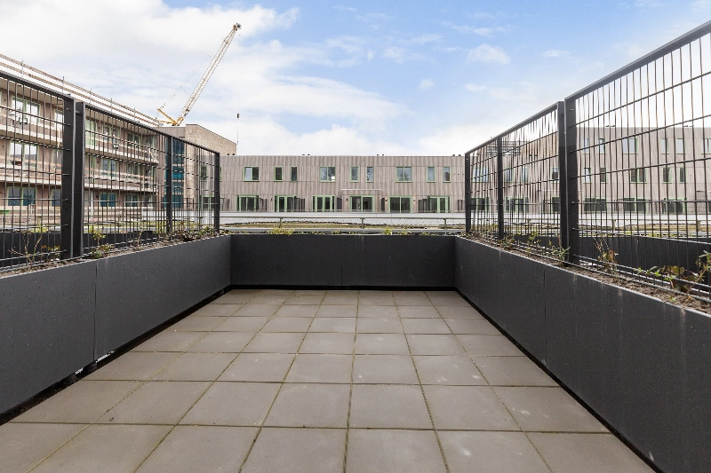 De woonkamer is tijdens de bouw met circa 1,2 meter uitgebouwd, wat zorgt voor een heerlijk ruime en lichte leefruimte. Via de schuifpui bereik je het royale terras op het westen, waar je geniet van de middag- en avondzon en een vrij uitzicht over het binnenterrein. Het terras is voorzien van geïntegreerde plantenbakken met een automatisch irrigatiesysteem.