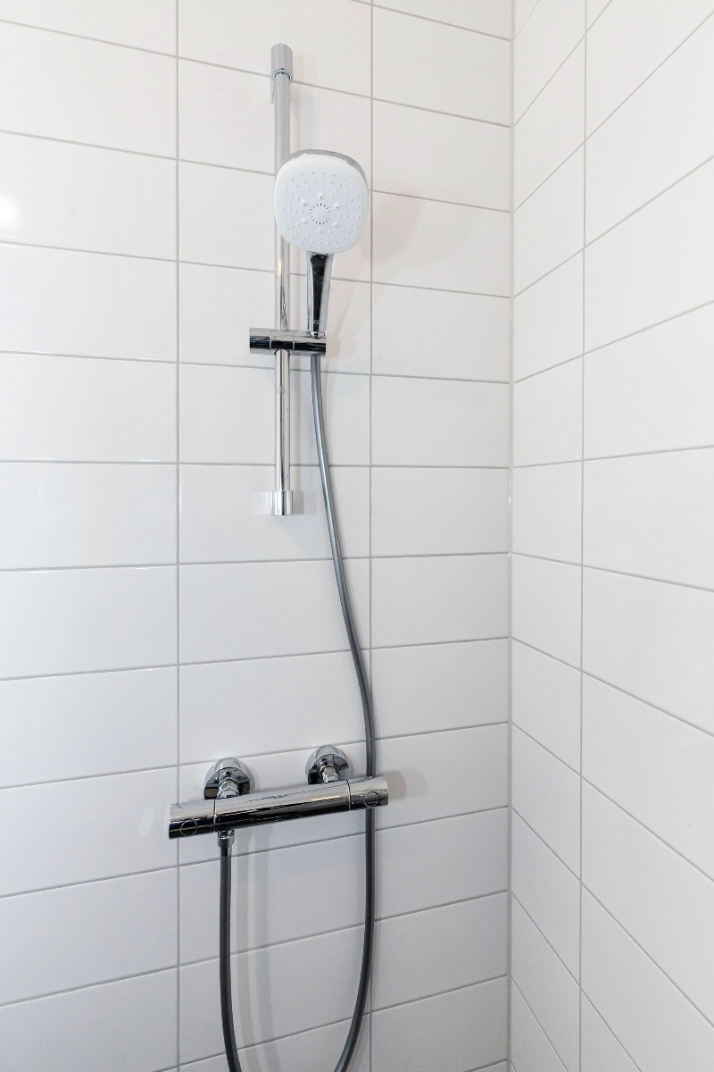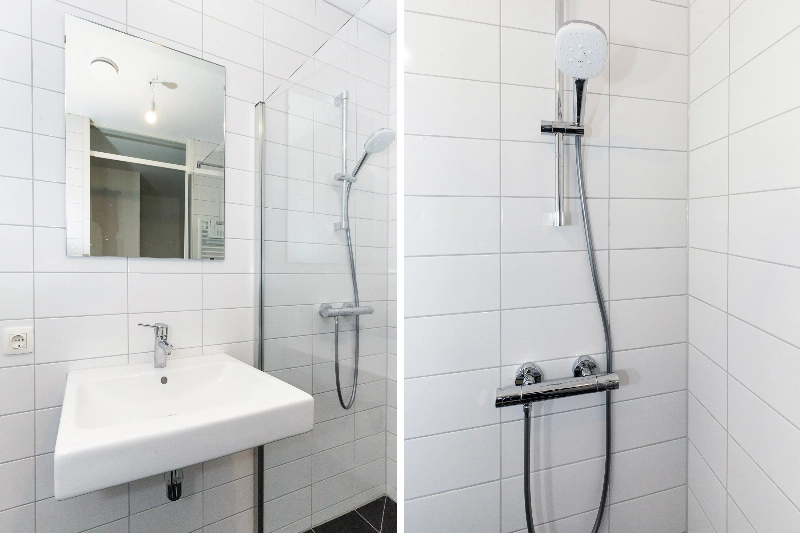 Tussen de slaapkamers in ligt de volledig afgewerkte badkamer uitgevoerd met witte wandtegels en antracietkleurige vloertegels en voorzien van een inloopdouche, 2e toilet, wastafel en een handdoekenradiator.