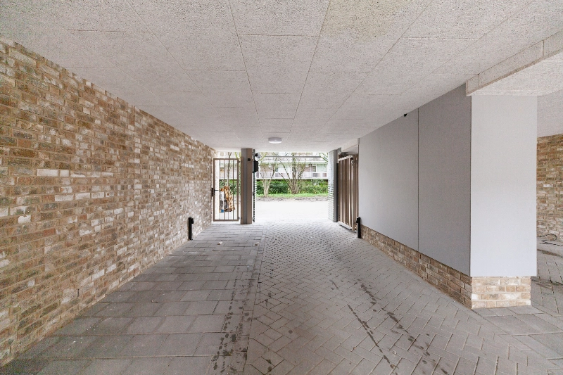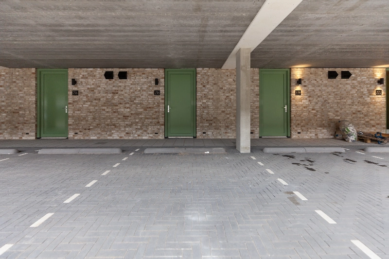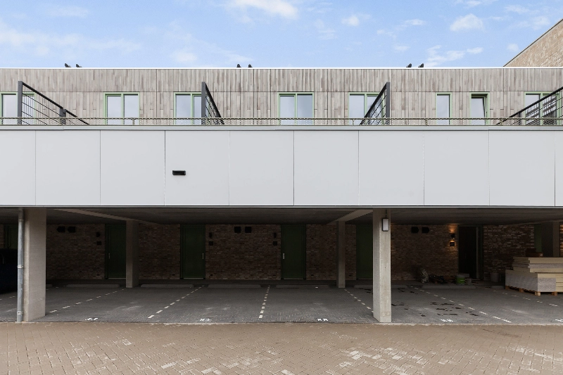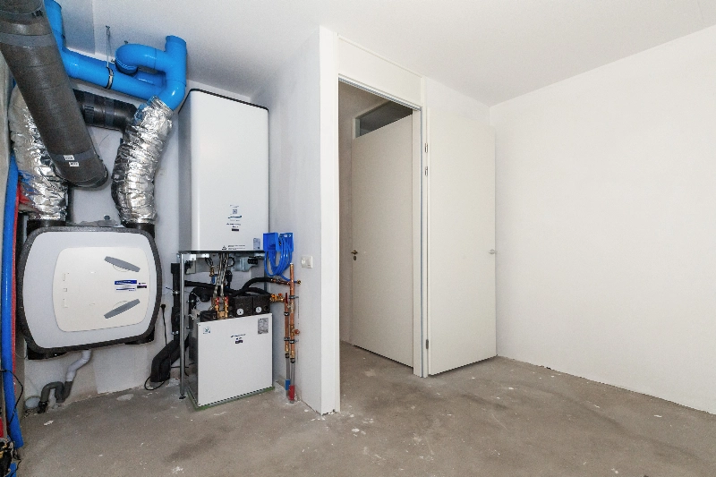 Aan de achterzijde van de woning bevindt zich een ruime inpandige berging met de opstelplaats voor de warmtepomp, WTW-installatie en boiler. Vanuit hier heb je toegang tot de achterzijde, waar je eigen parkeerplaats is gelegen. Deze bevindt zich onder het terras en is bereikbaar via een afgesloten elektrische poort.