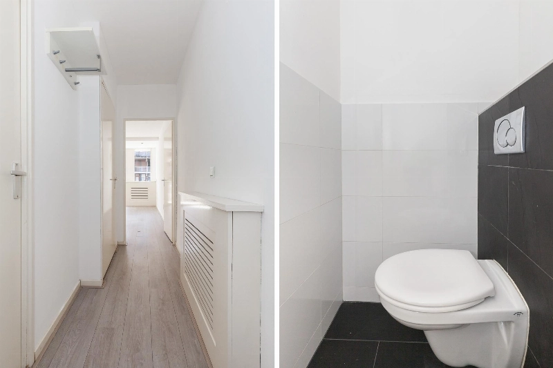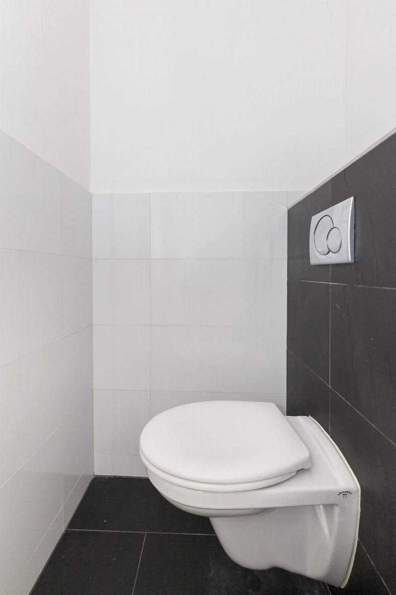 Entree, gang met gedeeltelijk zwart/wit betegeld toilet met een zwevend closet.