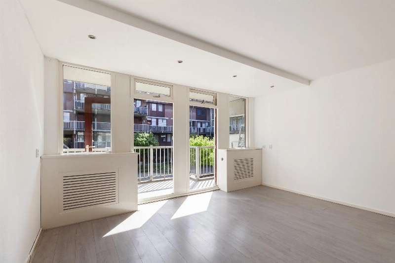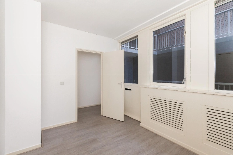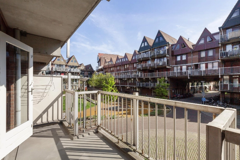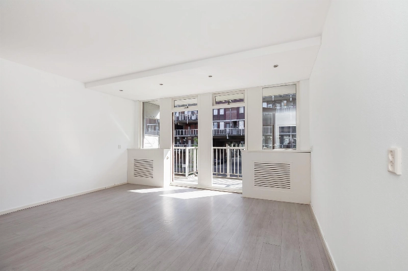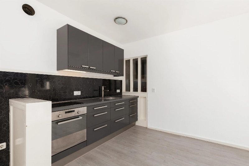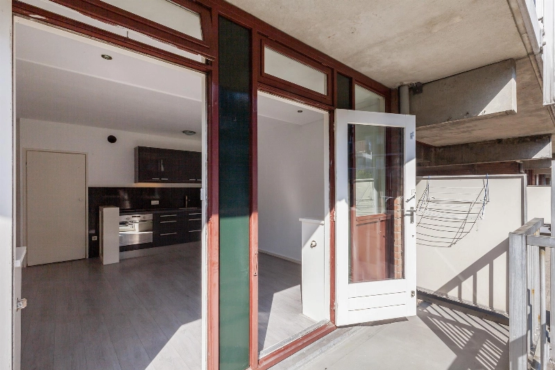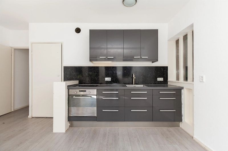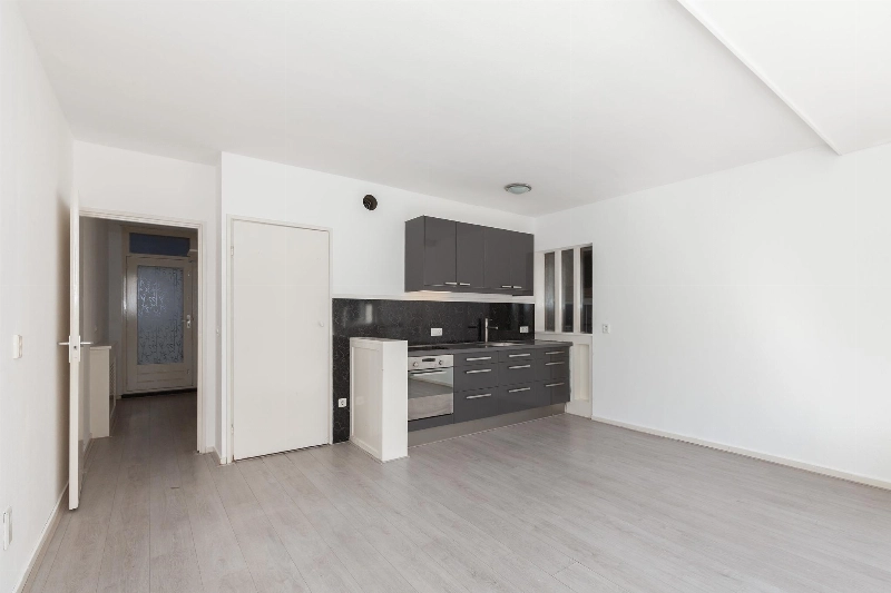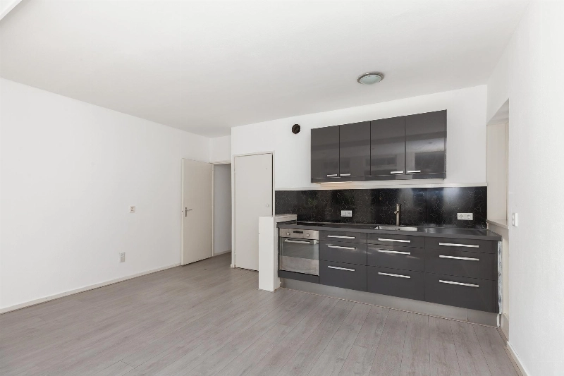 Deze lichte woonkamer heeft een prettig lichtinval door de vele ramen en er is een dubbele deur naar het balkon. Vanaf hier heb je een leuk uitzicht over het centrale plein van het complex. De woonkamer heeft een zijraam en is voorzien van een meterkast en een rechte keukenopstelling met bovenkastjes en voorzien van een elektrische kookplaat en een oven.