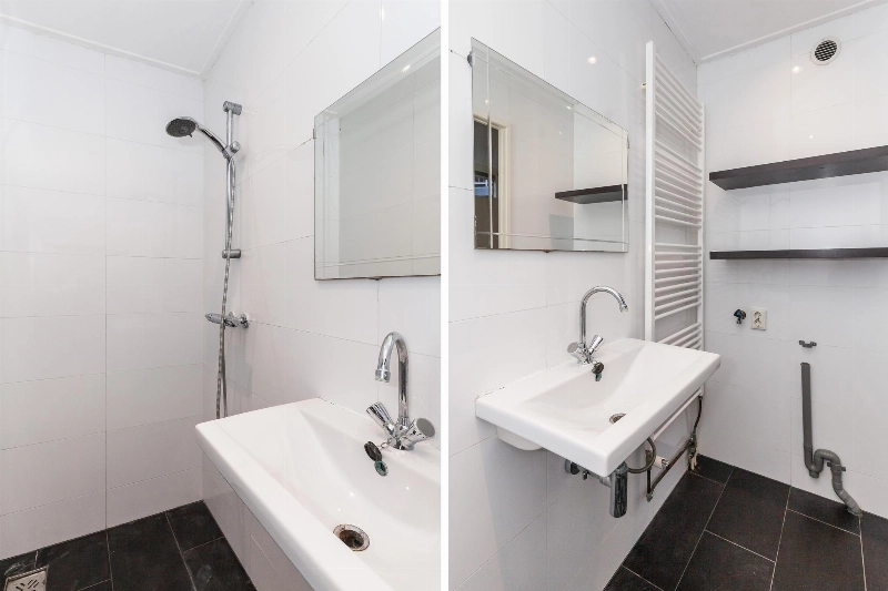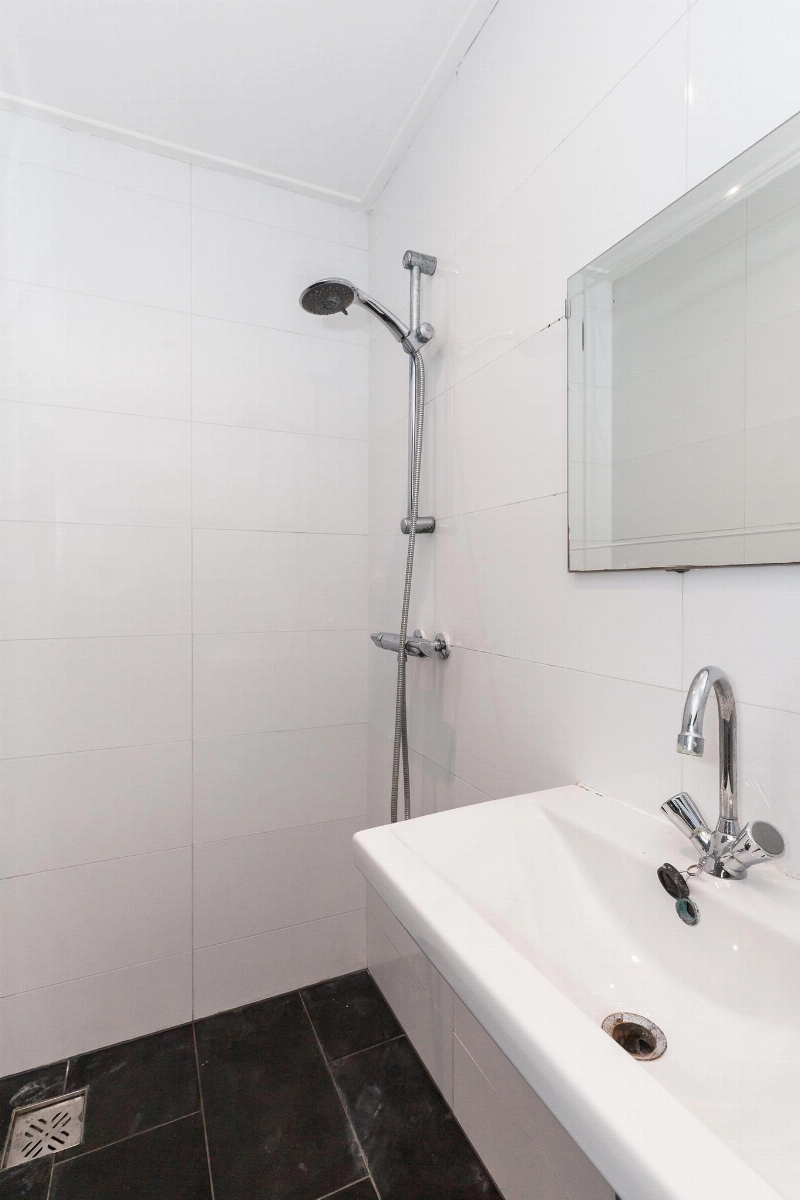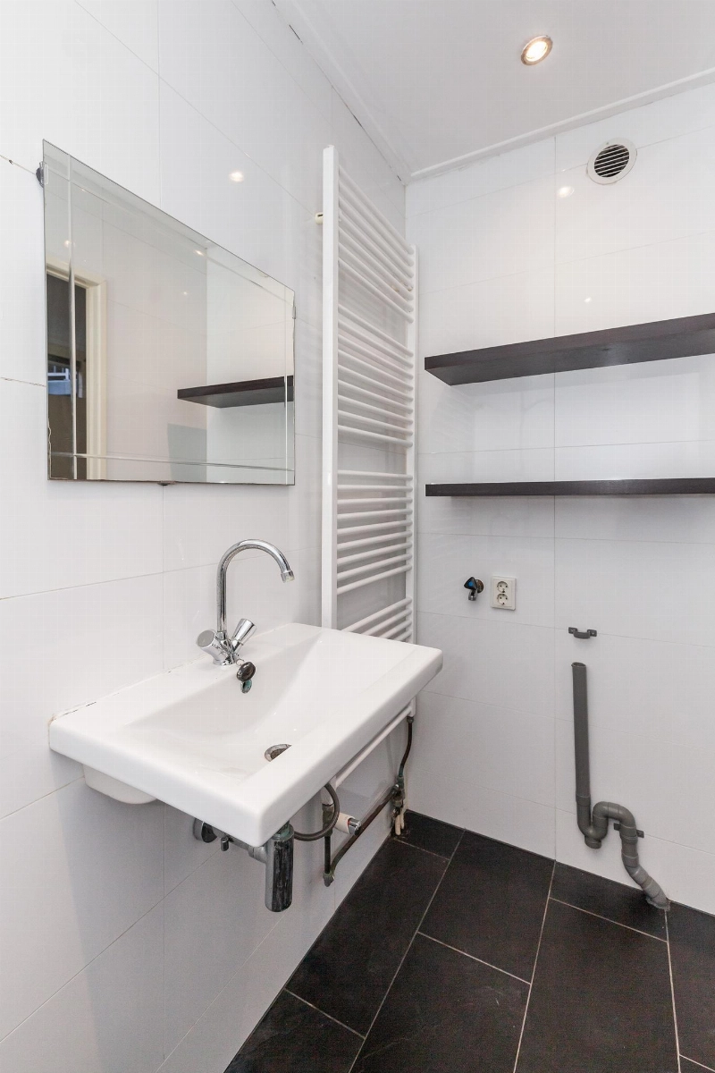 De badkamer is geheel betegeld en voorzien van een wastafel , douche-opstelling, radiator, aansluiting voor de wasmachine en twee handige plankjes voor de toiletspullen.