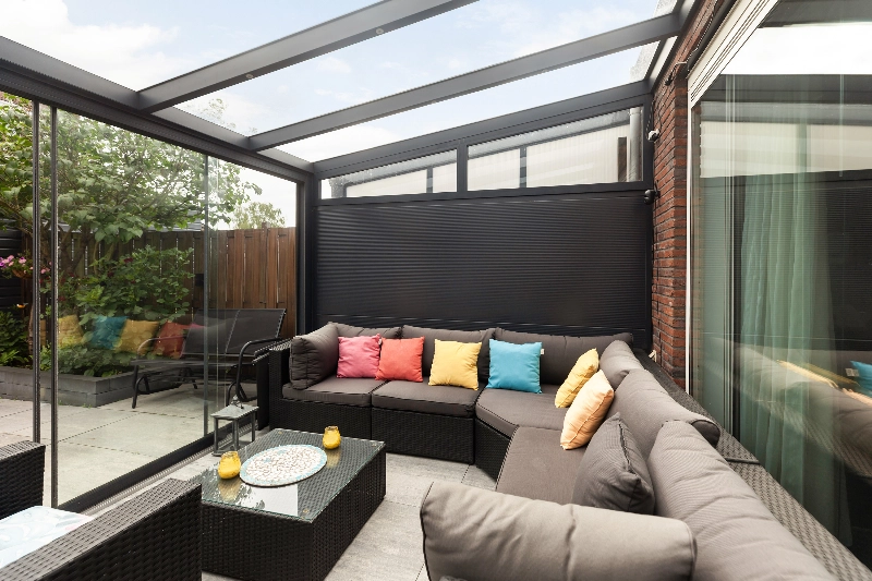 We gaan via de schuifpui naar buiten. Wow.....! Zo sta je in de prachtige serre met glazen schuifdeuren. Aan de gevel hangt een terrasverwarmer zodat je hier het hele jaar door kunt genieten. Tijdens de warme dagen schuif je alles lekker open en geeft het sfeer aan het geheel! En nog blijft er genoeg buitenruimte over. De tuin is modern betegeld en voorzien van groenborders, een houten berging en deur naar achterom.