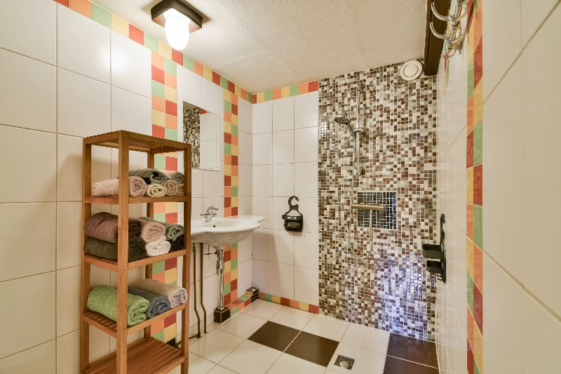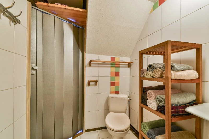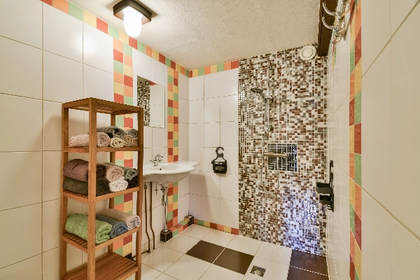 Naast de trap naar de tweede verdieping bevindt zich de badkamer. Deze is uitgevoerd met lichte betegeling in combinatie met mozaïek betegeling en beschikt over een douchehoek met thermostaatkraan, een wastafel met spiegel en een toilet.