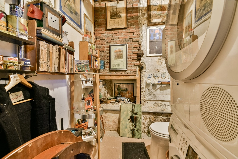 Entree, ruime hal met de nog originele ramen en een meterkast. Grote werkruimte/garage met een aparte wasruimte voorzien van toilet. Deze wasruimte is desgewenst eenvoudig te verwijderen waardoor de werkruimte nog groter wordt.
