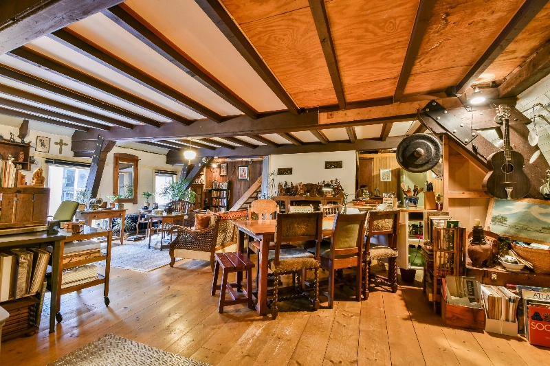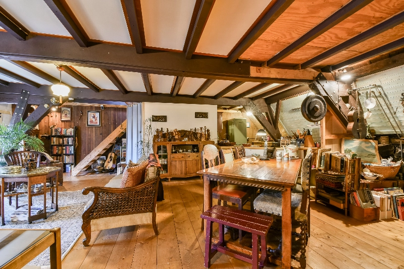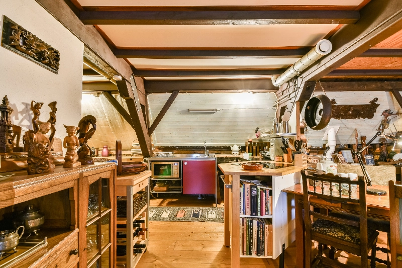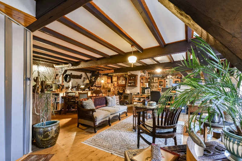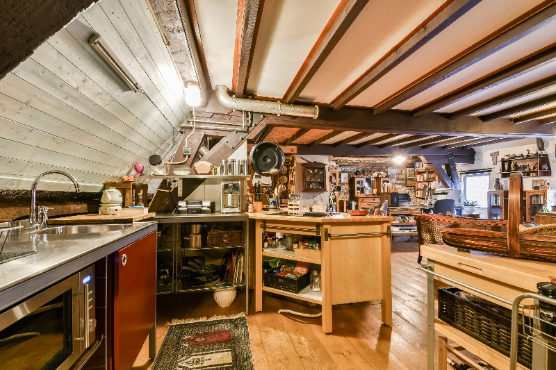 Mooie ruime woonkamer met een houten vloer en een karakteristiek balkenplafond. De grote ramen bieden een fraai uitzicht op de haven. De open keuken is uitgevoerd met een eenvoudige opstelling van losse houten en RVS-elementen en voorzien van een inductiekookplaat en losse apparatuur.