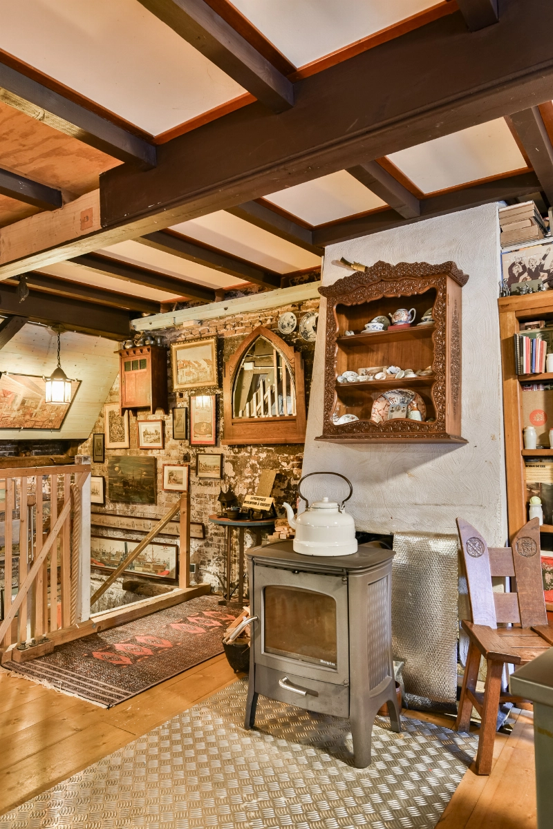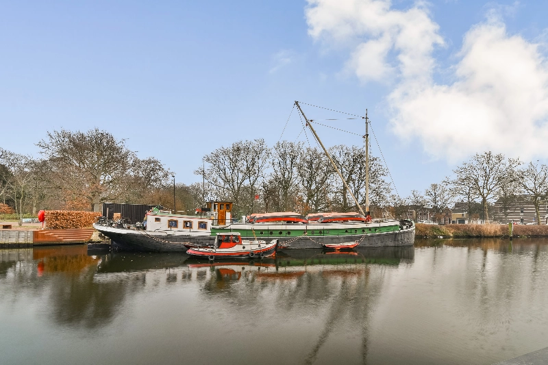 Via de trap bereikt u de eerste verdieping waar een royale woonkamer met open keuken u verwelkomt. De keuken heeft een eenvoudige opstelling uitgevoerd in RVS en hout en voorzien van een inductiekookplaat en losse apparatuur. Vanuit het zitgedeelte geniet u van een leuk uitzicht op de haven, terwijl de houtkachel zorgt voor warmte en extra gezelligheid.