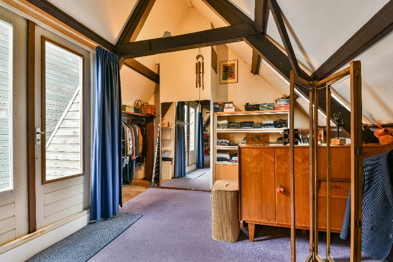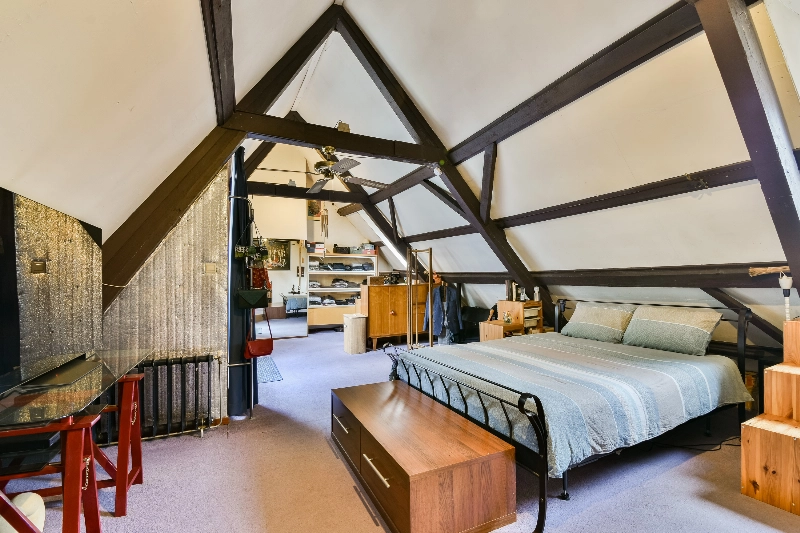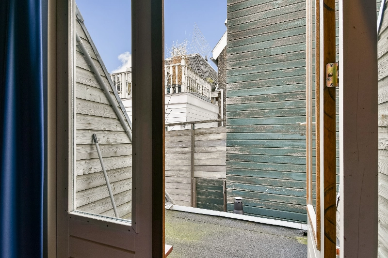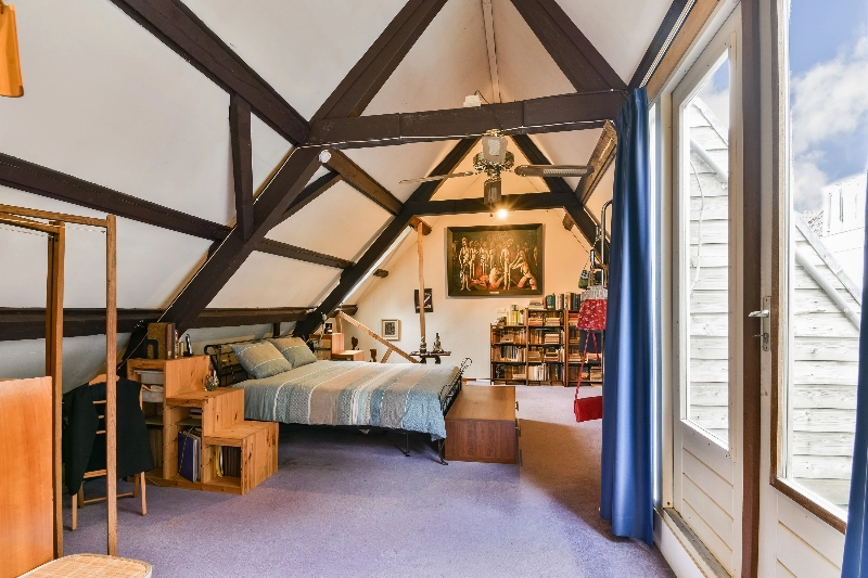 De tweede verdieping biedt een grote, open slaapkamer met twee dakkapellen en dubbel openslaande deuren naar een loggia. Een heerlijke lichte ruimte met karakter, die desgewenst eenvoudig kan worden ingedeeld in twee slaapkamers.