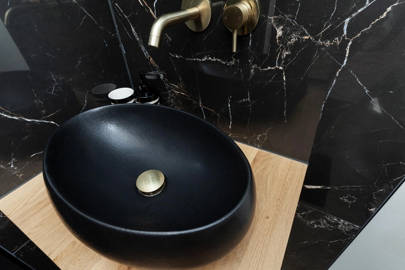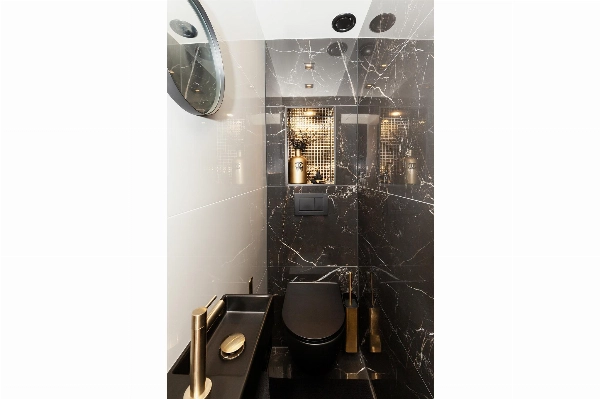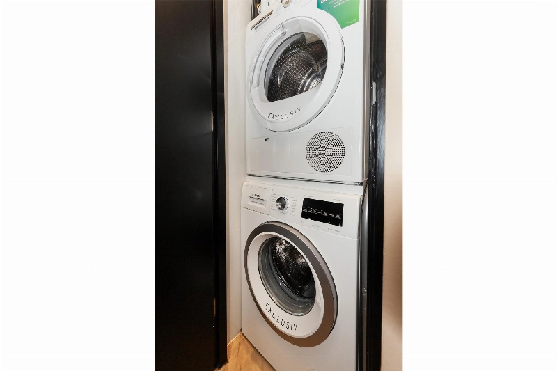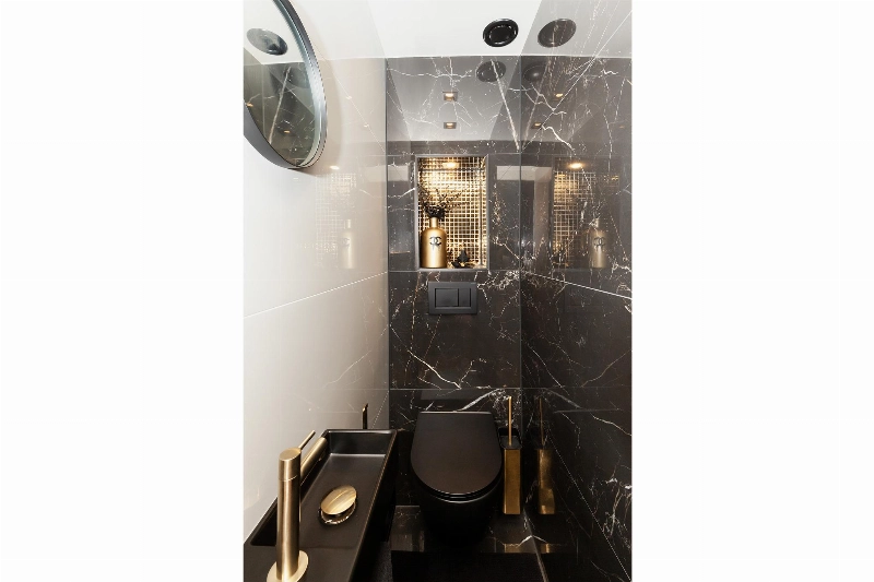 Aan de voorzijde bevindt zich een vaste kast met de Daikin warmtepompboiler en een kleine tussenhal in de woonkamer geeft plek aan het luxe betegelde toilet met zwevend closet en fontein en een aparte en betegelde wasruimte.