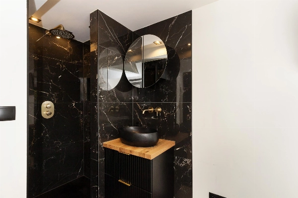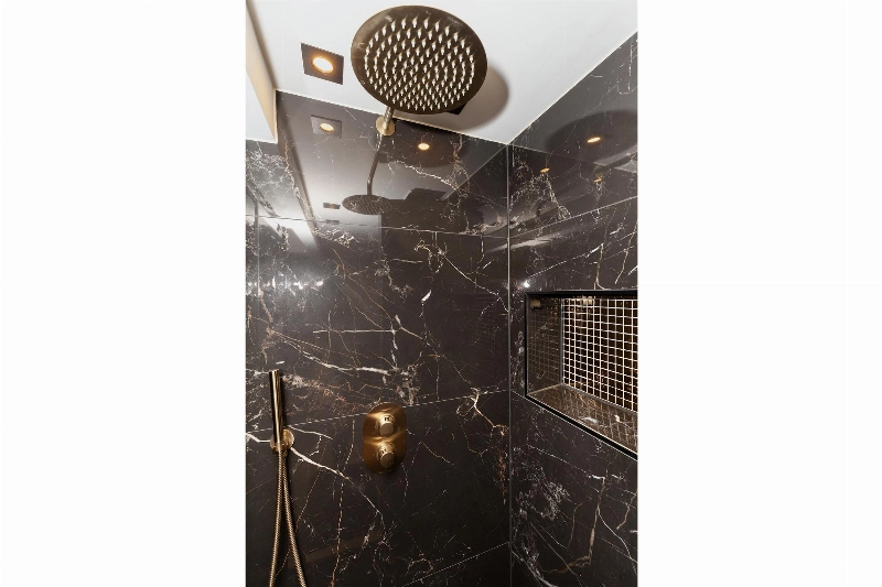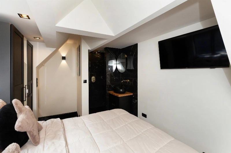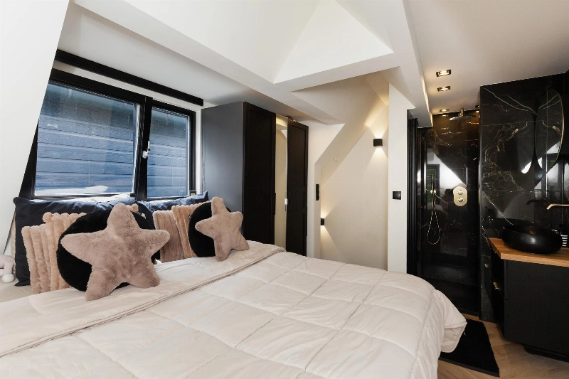 In deze open ruimte zijn twee dakkapellen geplaatst waardoor een prima ruimte is ontstaat voor een groot bed en kledingkast. Deze slaapkamer ademt sfeer door de balken in zicht en door het raam heb je een leuk zicht over het water en het park. In de hoek vind je de wastafel met meubel en spiegel en een grote inloopdouche met betegeling en de vloerplaat met drain is strak in één plaat gelegd.