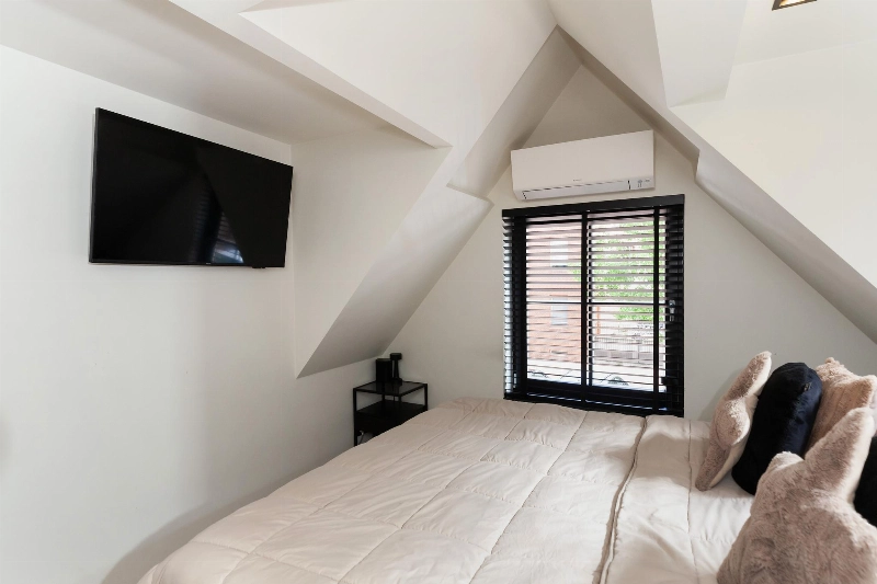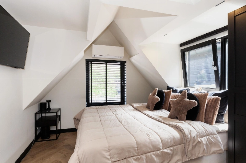 Via de woonkamer ga je via de nieuw geplaatste houten trap naar de slaapverdieping met ook hier weer PVC visgraatvloer, gestucte wanden en een airco.