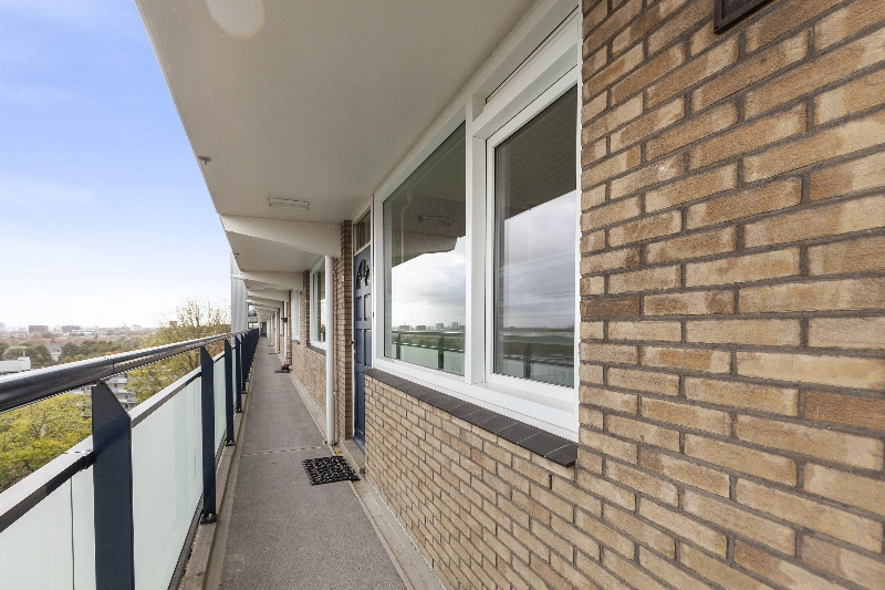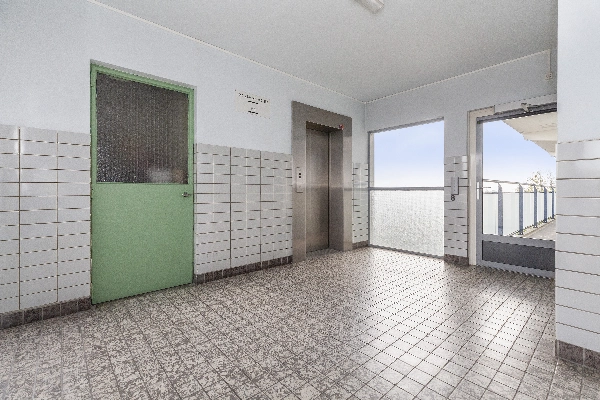 De entree van het appartement is gelegen op de galerij van de 8e verdieping.