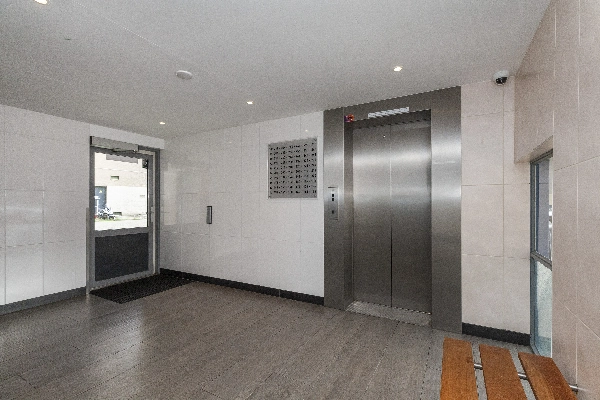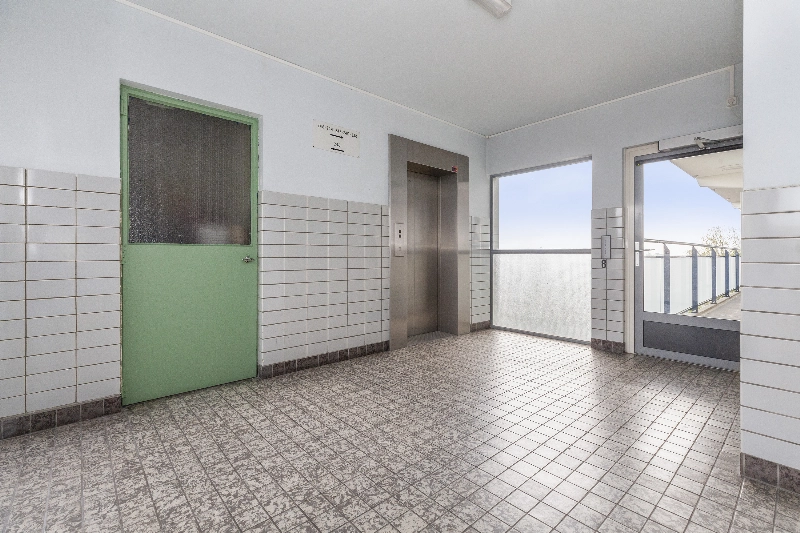 Vernieuwde, afgesloten entree met bellentableau en afgesloten toegang tot de bergingen en liften.