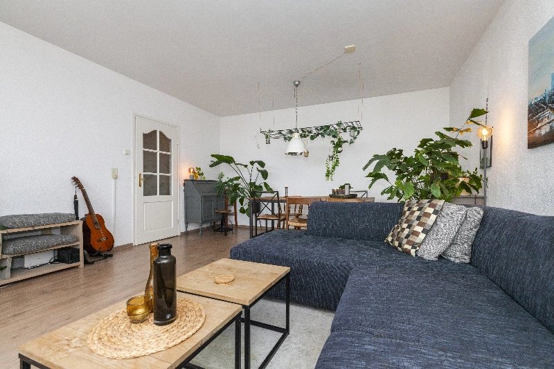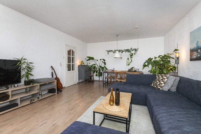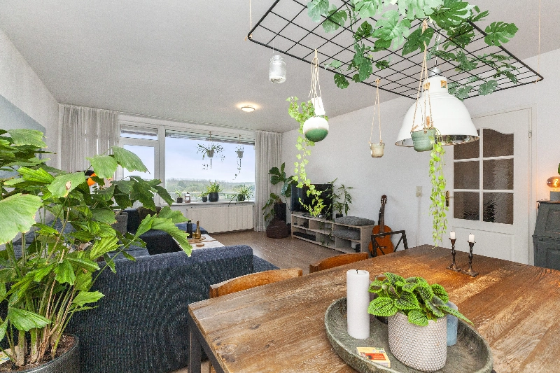 De woonkamer ligt aan de achterzijde en is een mooie ruimte met veel lichtinval. Via de woonkamer bereik je het zonnige balkon. Deze is gelegen op het westen en geeft dat mooie uitzicht over het groen van “Broekpolder”!