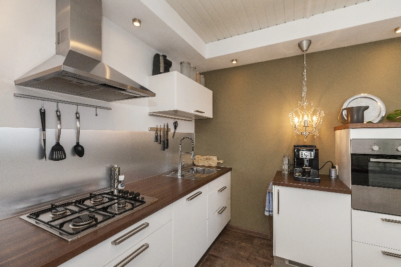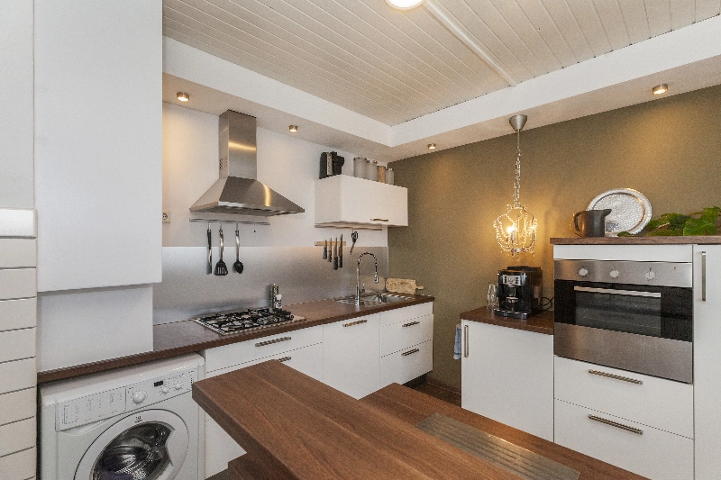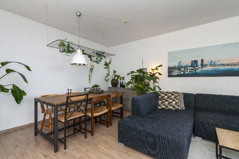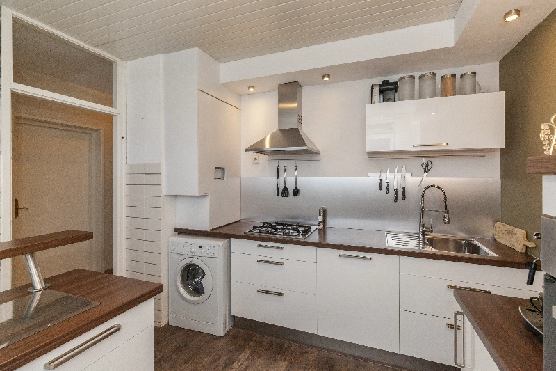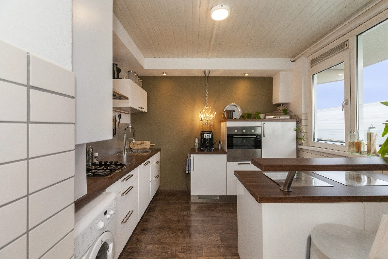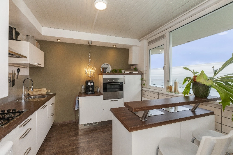 De ruime woonkeuken ligt aan de galerijzijde en is uitgevoerd in een ruime, witte opstelling met kunststof houtlook aanrechtblad. Zo is er een lage opstelling voorzien van 4-pits gaskookplaat, afzuigkap, vaatwasser en veel kastruimte. De 2e opstelling is hoger uitgevoerd en geeft plek aan de koelkast, vriezer en oven. En dan is er nog die leuke eetbar waar je met een kopje koffie kunt genieten van het mooie uitzicht over Vlaardingen en Schiedam. In de keuken vind je tevens een kast met de opstelling van de CV-ketel en de aansluiting voor de wasmachine.