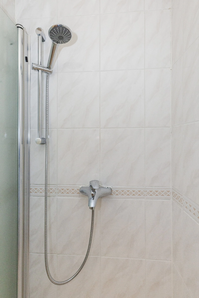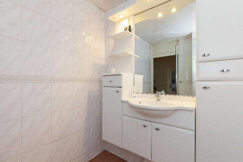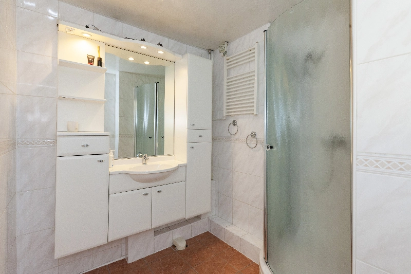 De badkamer is betegeld in een lichte kleurstelling en voorzien van een douchecabine, een wastafelmeubel en een radiator.