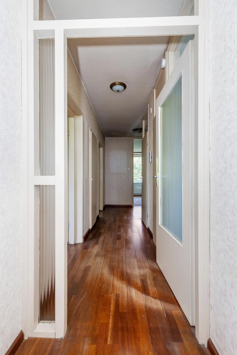 Entree, diepe gang welke voorzien is van een parketvloer die doorlopen naar de hoofdslaapkamer en woonkamer. Via deze centrale gang heeft u toegang tot alle vertrekken. In de gang vindt u de meterkast met 6 groepen en aardlekschakelaar, een vaste kast en het geheel betegelde toilet met fontein.
