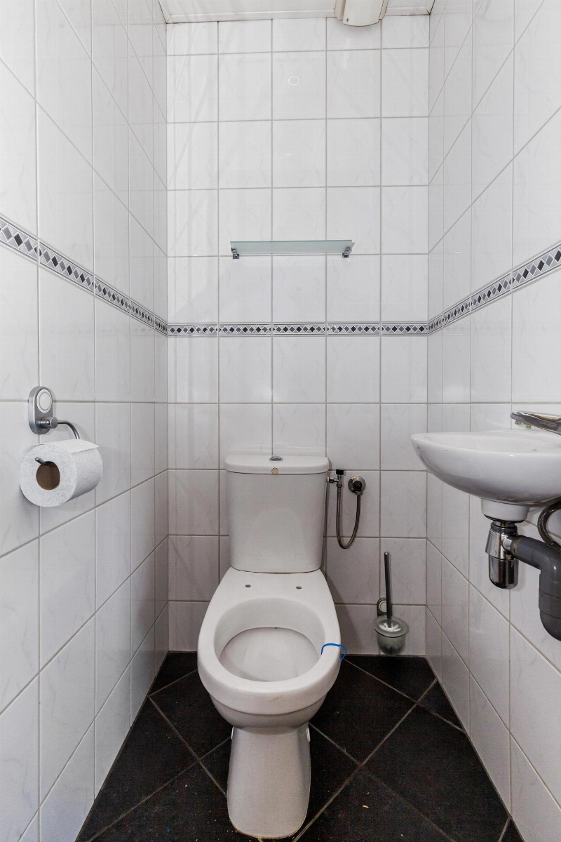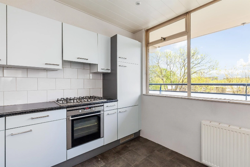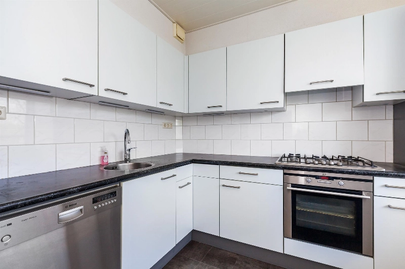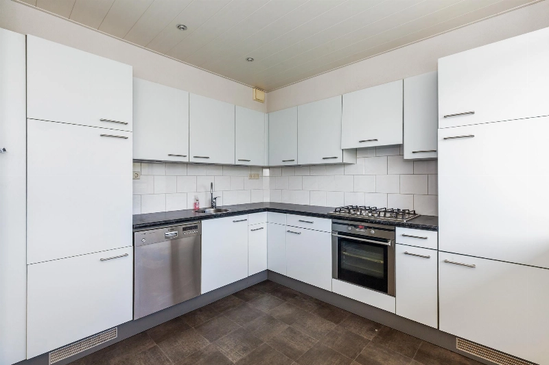 De ruime woonkeuken ligt aan de voorzijde en is uitgevoerd in een keurige lichte hoekopstelling met achterwandbetegeling, koelkast, afzuigscherm, 5 pits gaskookplaat met oven en een vaatwasser. Vanuit de keuken heeft u een mooi uitzicht over Vlaardingen en Schiedam. In de keuken vindt u tevens een kast met de opstelling van de CV-ketel.